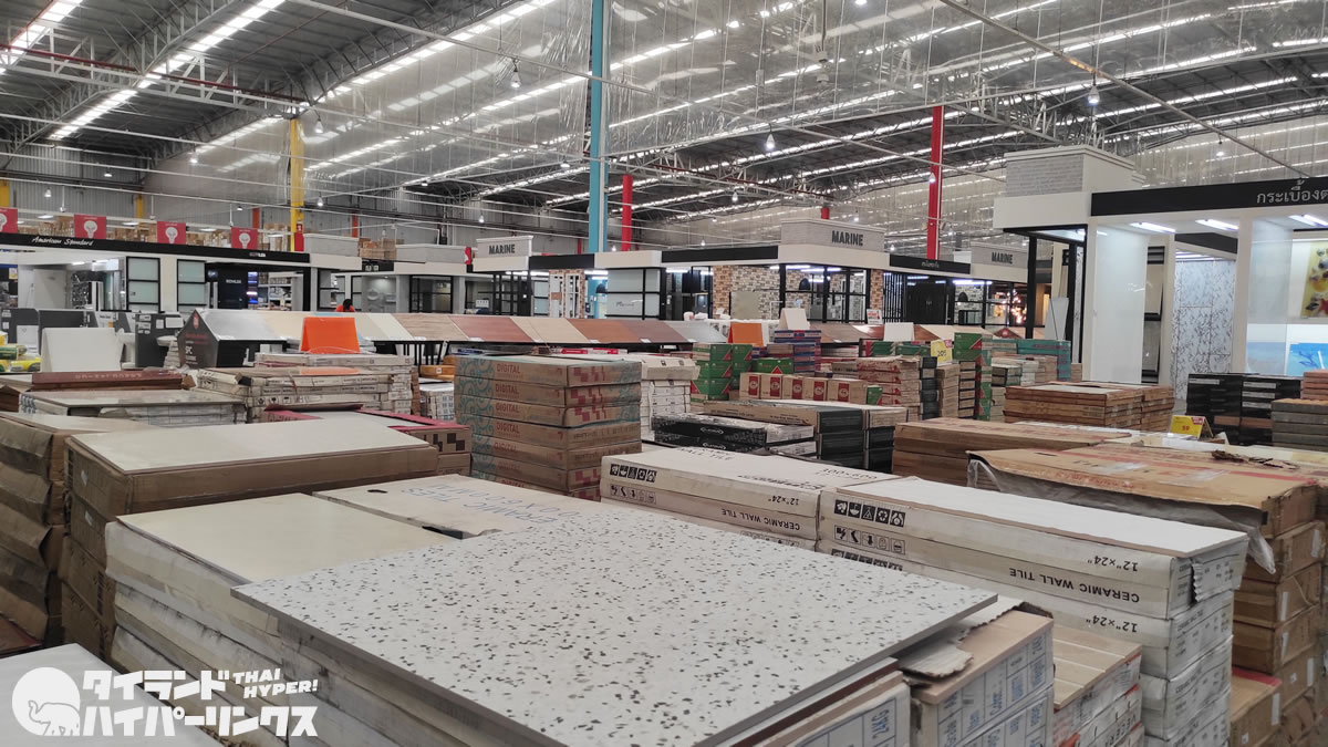 店舗に足を踏み入れた瞬間に圧倒される広さと天井の高さ。体育館どころか、展示会場並みの巨大さ。タイル一つを見ても圧巻の品揃えで、これまで訪れたホームセンターの中でもダントツの種類の多さでした。高級なものを別にすればですが、「DO HOME バーンブアトーン店」なら好みのタイルは必ず見つかると言っても過言でないかもしれません。
