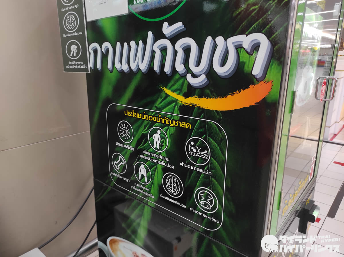 ここはバンコク・ラプラオ通りにあるショッピングセンター「BigC エクストラ ラプラオ2店」。店内のATMが並ぶ場所に一緒に置かれていたのが、大麻カフェの自動販売機でした。