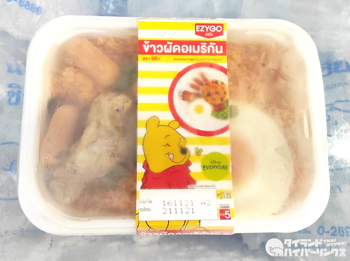 かわいい「くまのプーさん」が描かれた「カオパット・アメリカン」弁当。プーさんの黄色と炒飯の赤のコントラストが鮮やかで、味のことなんて関係なく即決購入。45バーツを支払い、レジで温めてもらい、早速帰っていただきます。