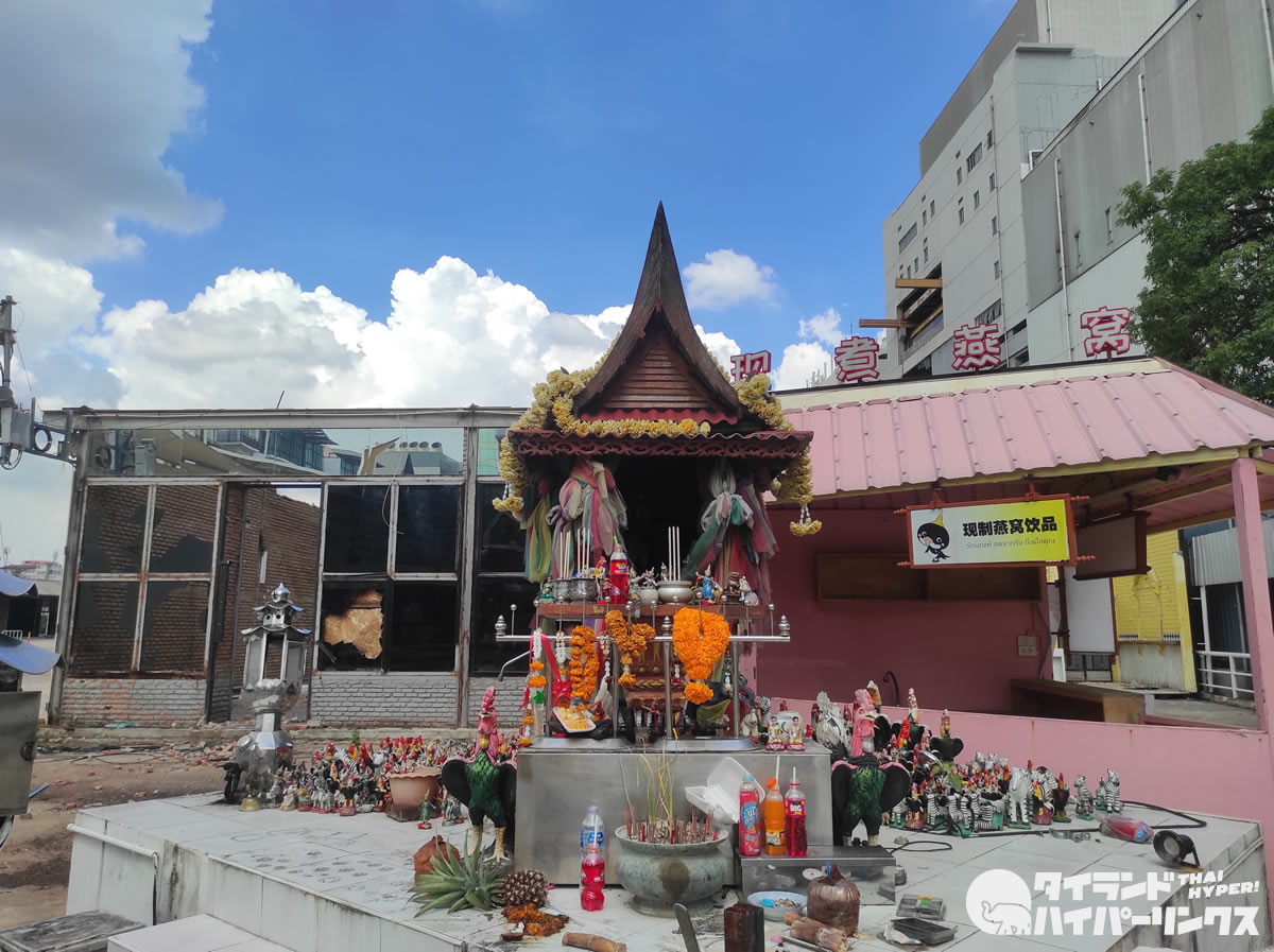 テントだけでなく一般店も人の姿はなく、取り壊し前といった感じ。たくさんのお供え物があった祠も、寂しい限りです。