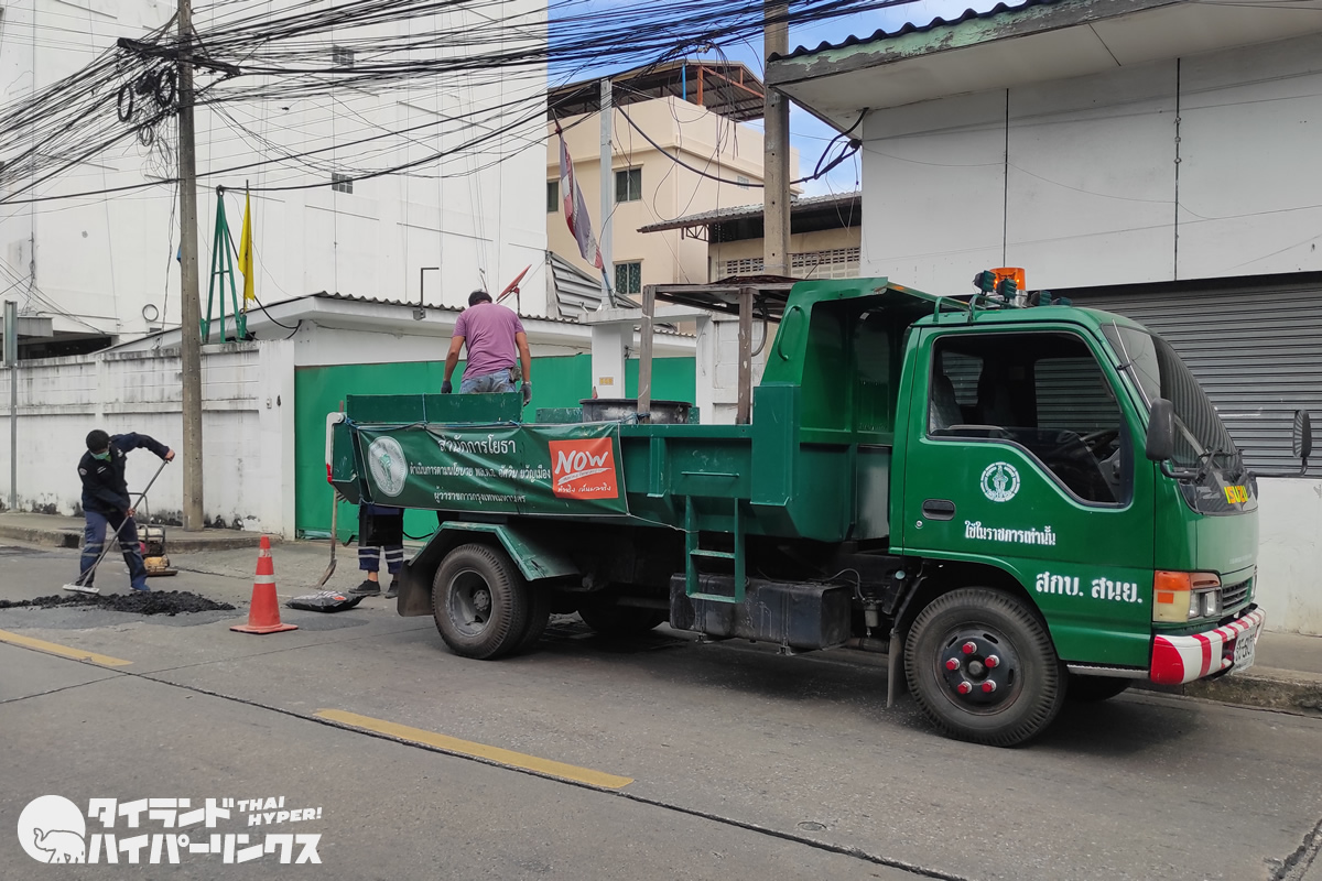 バンコクの街を歩いていると、緑色の大きなトラックが駐車中。どうやらこれはバンコク都の公共事業局のトラックで、道路工事中のようです。