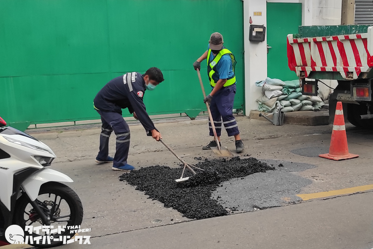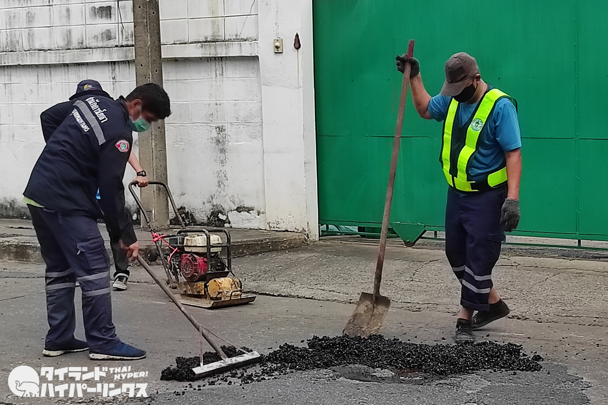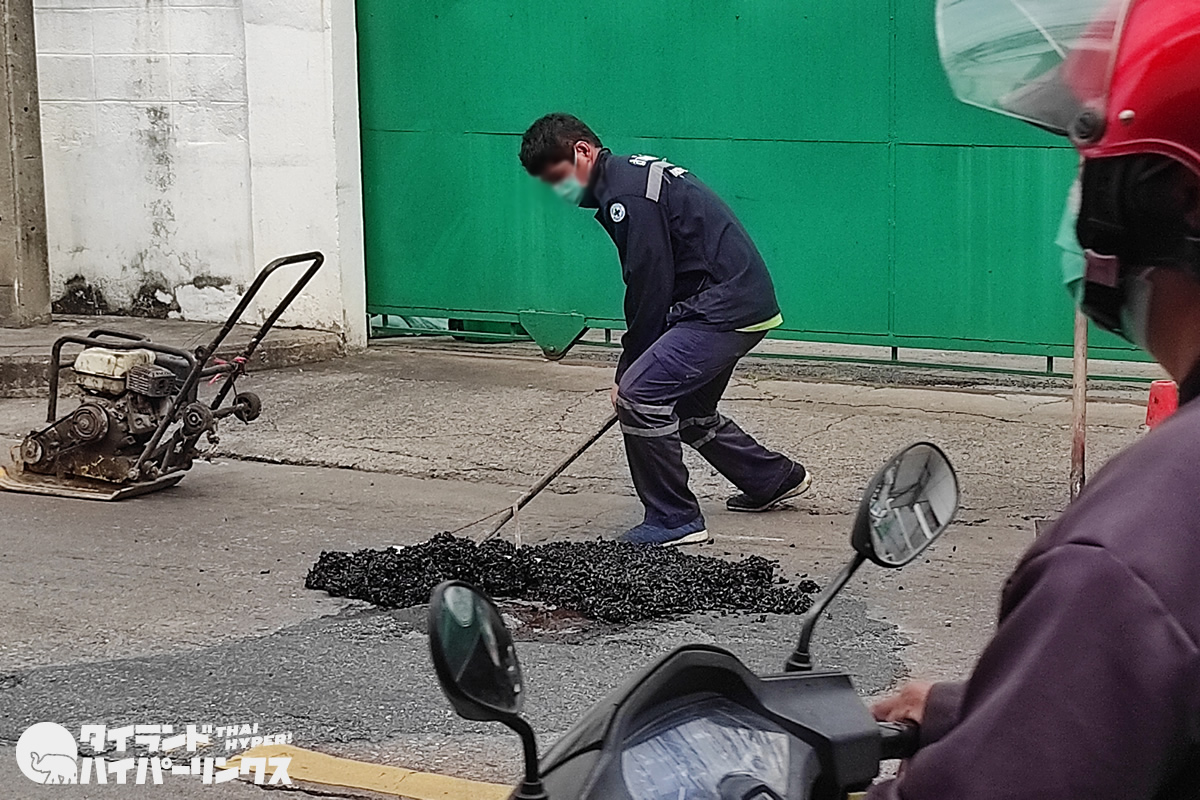 大掛かりな工事でなく、ちょっとした補修工事のようで、穴をアスファルトで塞いでいるようです。時々道路工事をした部分が、デコボコになってしまっている箇所を見ますが、それを平らに直しているんですね。