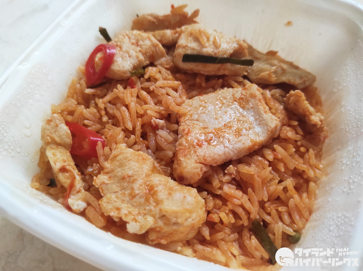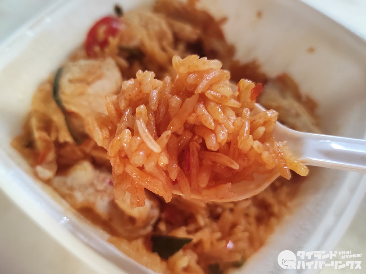 鶏肉たっぷりの「トムヤムチャーハン弁当」。トムヤム色に赤く染まったタイ米も実に美しいですね!