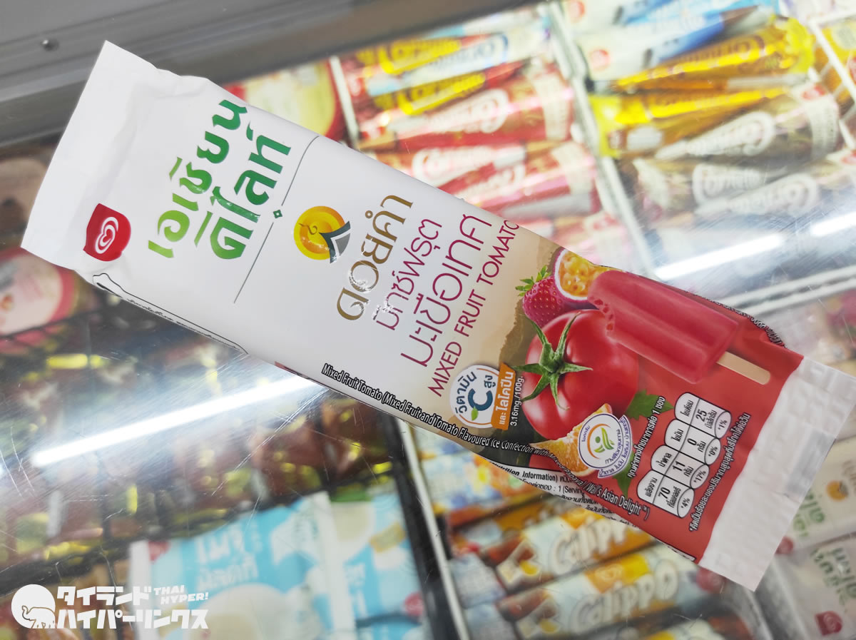 そんな「ドーイカム」ブランドのアイスが、以前より「ウォールズ(Wall’s) 」から販売されていて、その新商品が「ミックスフルーツトマト(มิกซ์ฟรุต มะเขือเทศ ミックスフルーツマクアテート)」です。