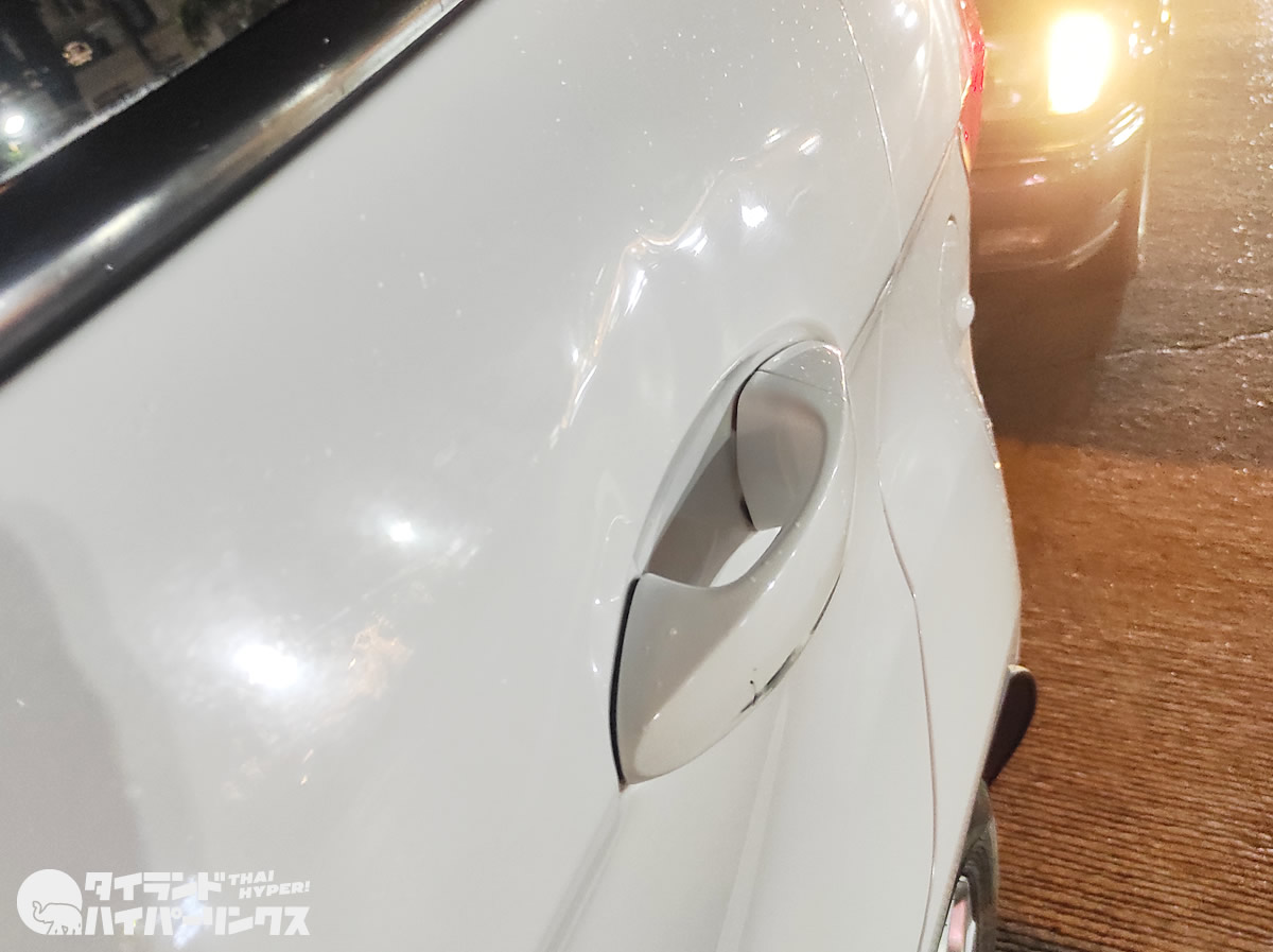 接触したのは、同乗していた白い車の左後部のドアハンドルと、もう一台の黒い車の右ドアミラー。白い車はドアハンドルに傷が付き、ボディも接触したときのショックで凹みが出来ていました。黒い車は、ドアミラーに傷です。