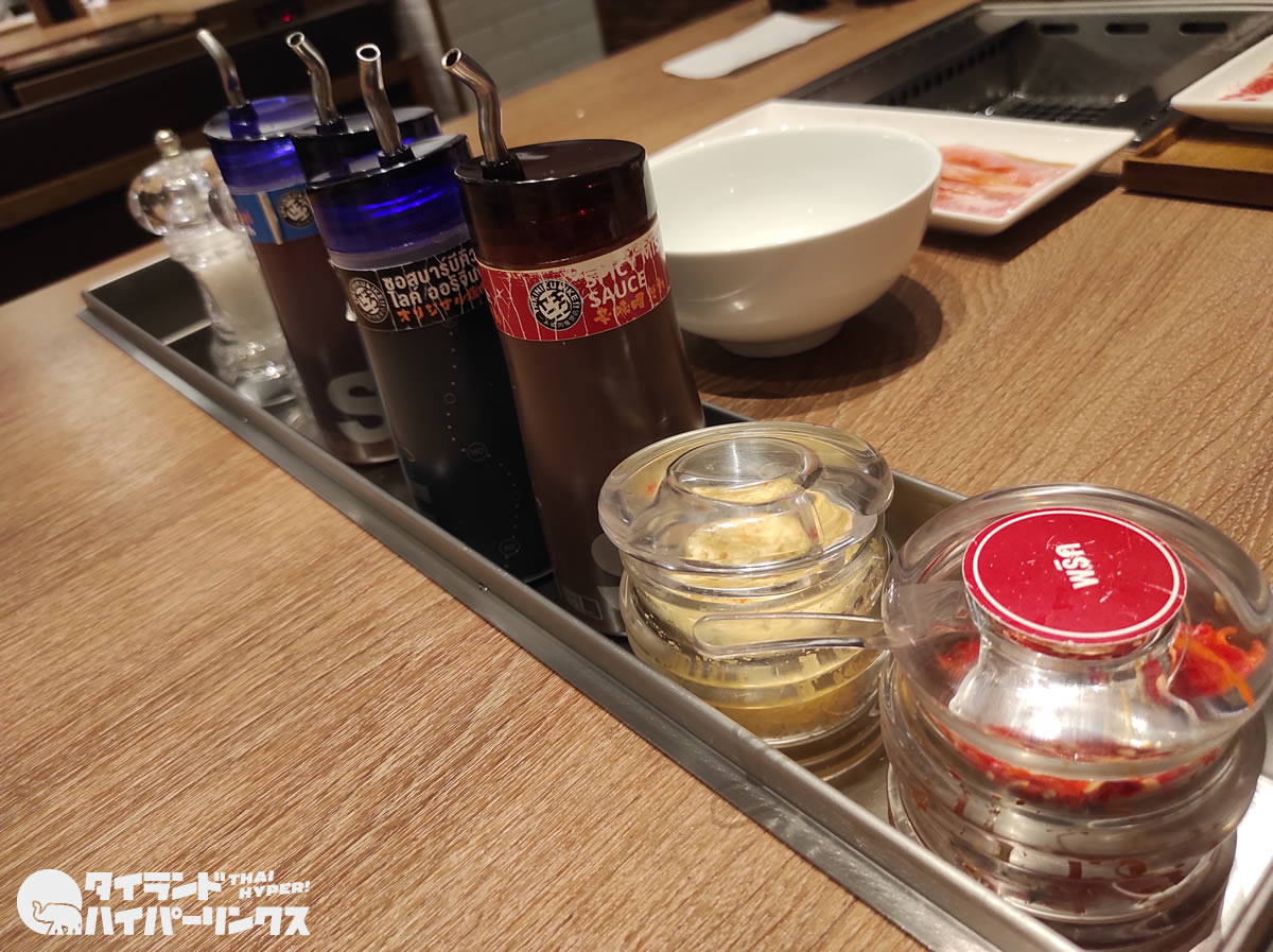 テーブルには「オリジナル」「塩」「味噌」「ニンニク」の4種類のタレ。さらに塩、胡椒とニンニク、唐辛子。