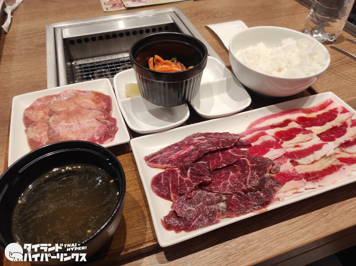 この日オーダーしたのは、「ライクセット」でした。牛タン・ハラミ・カルビが合わせて250グラム。ご飯にキムチ(またはサラダ)、スープが付いて399バーツ。