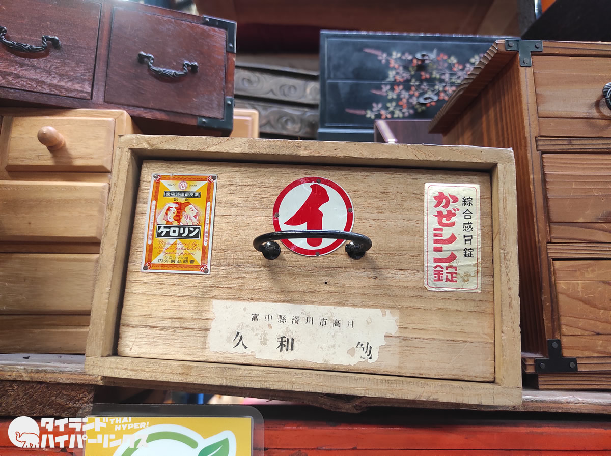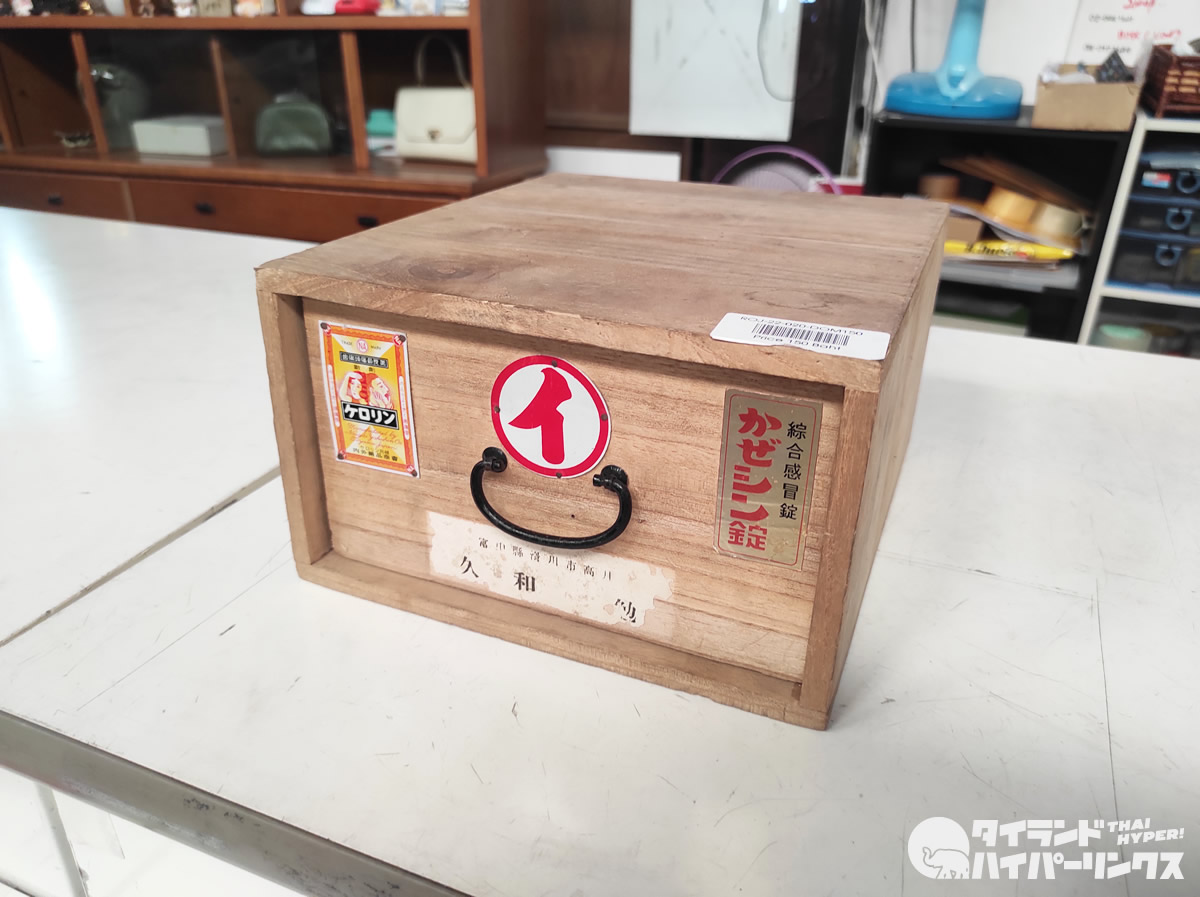 結局この日は、見つけた瞬間気になって仕方がなかった富山の置き薬の薬箱を購入。値札は150バーツでしたが、支払い時に割引されて130バーツでした。日本円にして約500円です。