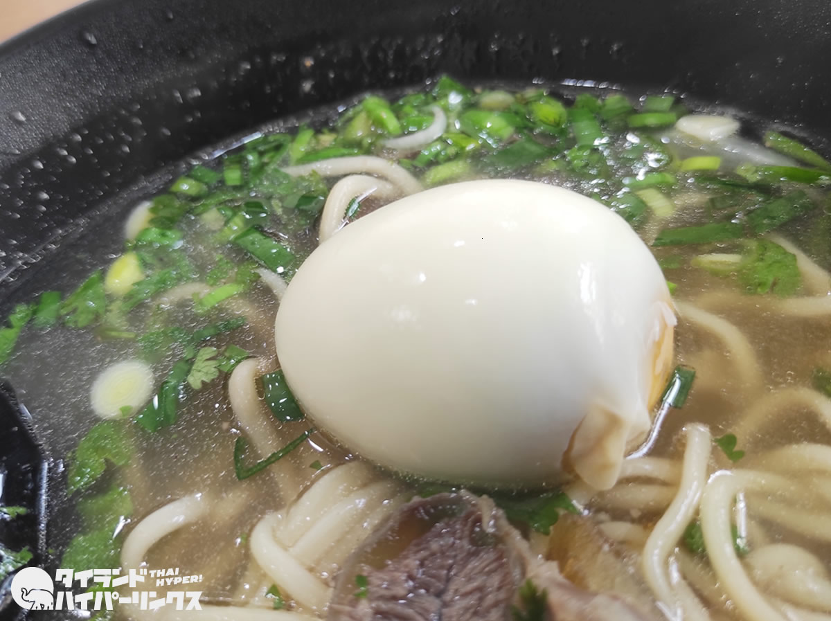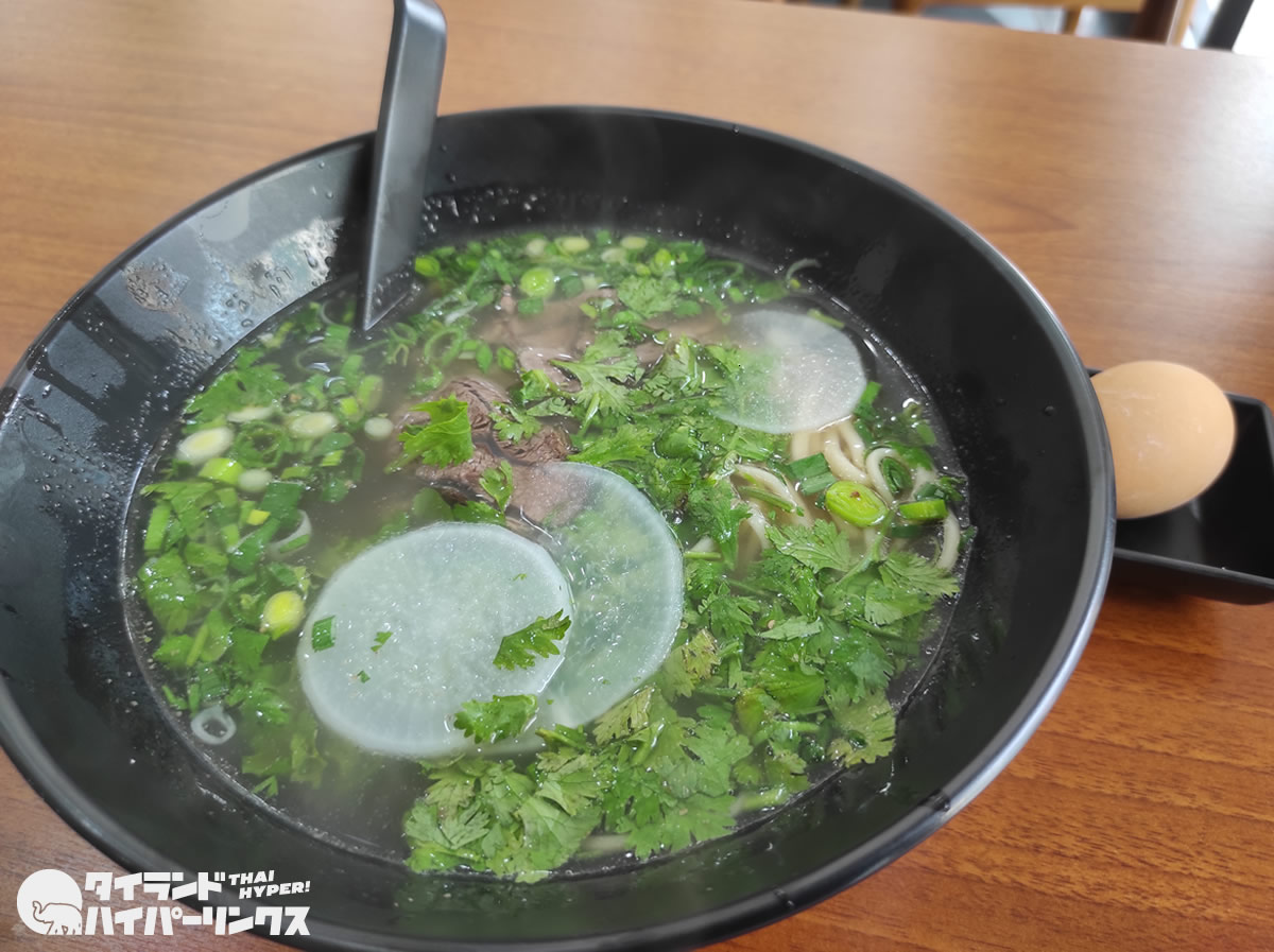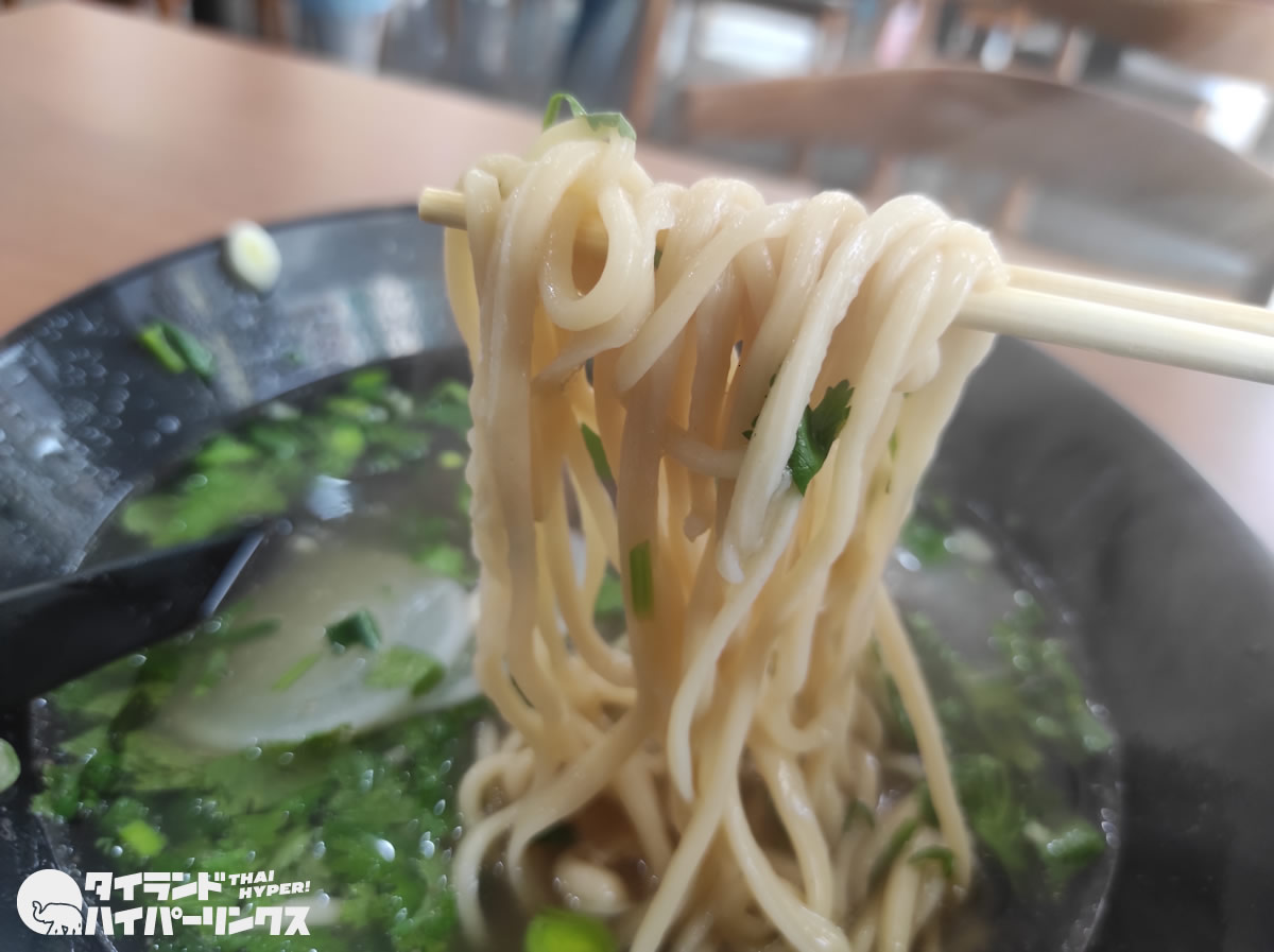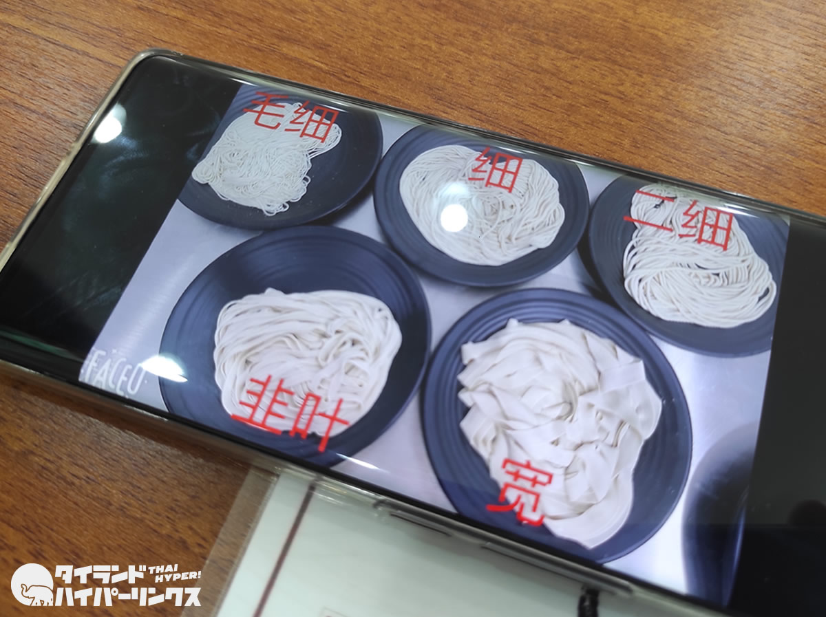 今回オーダーしたのは、「牛肉拉面」(150バーツ)です。また「麺の太さはどうしますか?」とスマホを見せられ、「二細」をお願いしました。