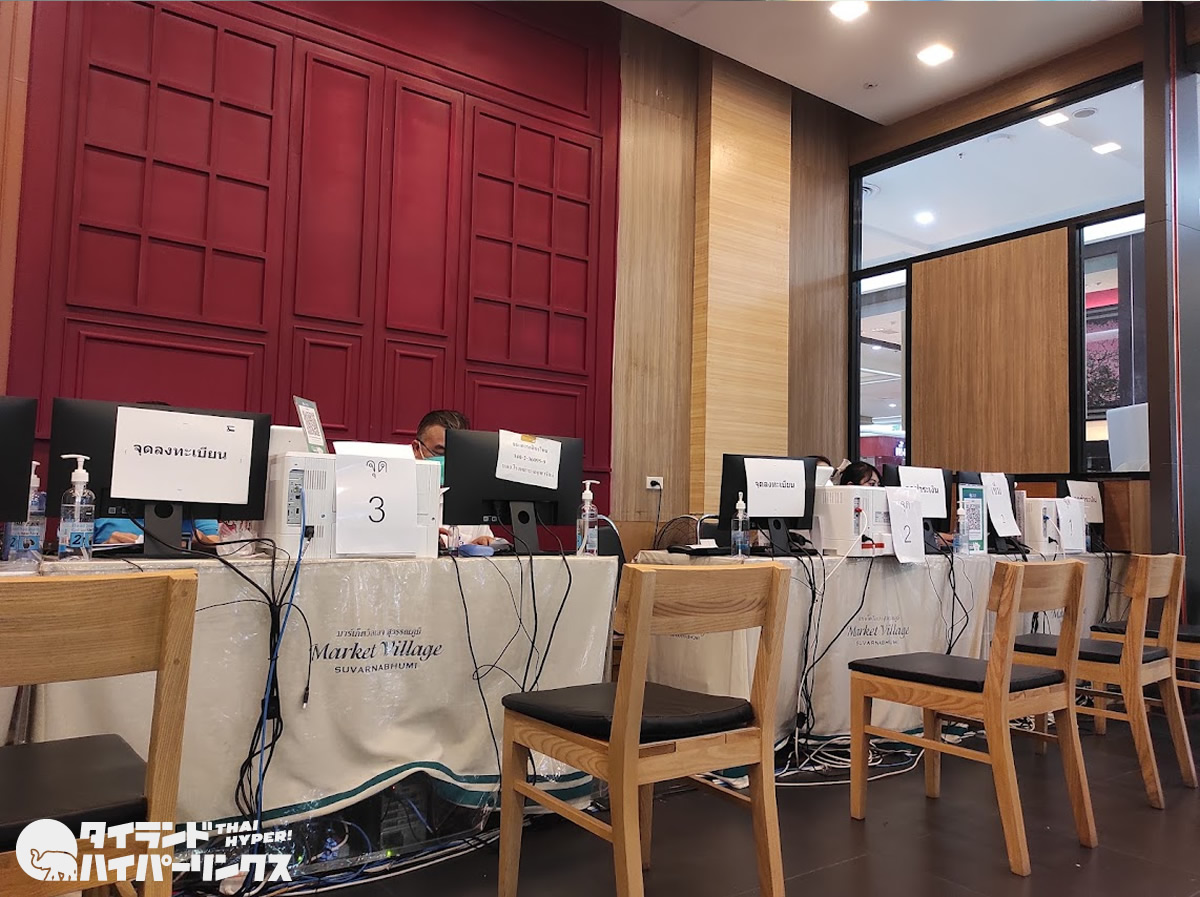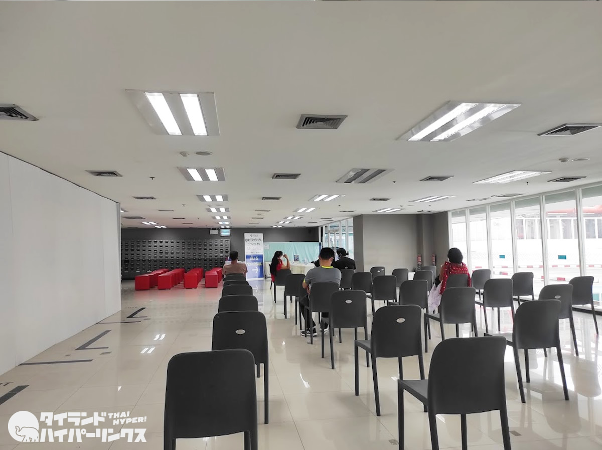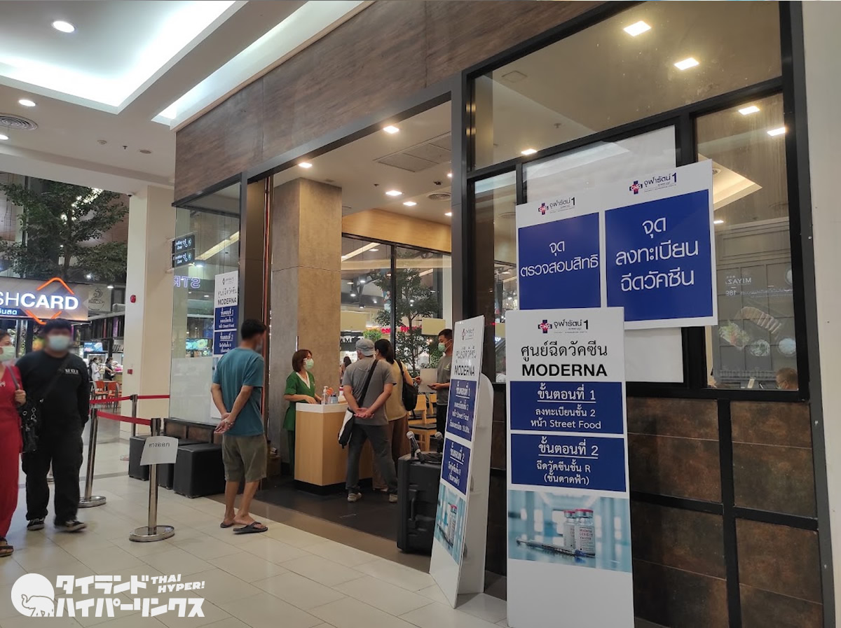 モデルナ製ワクチンを購入したのは、チョララット3病院。この日の接種はチュララット1病院によるもので、会場の「Market Village」へ。まずは2階で受付です。
