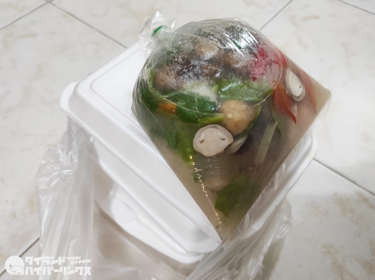 我が家も久々の注文です。シーフードのトムヤムスープ1つとガパオライス目玉焼き付き3つで合計185バーツ。