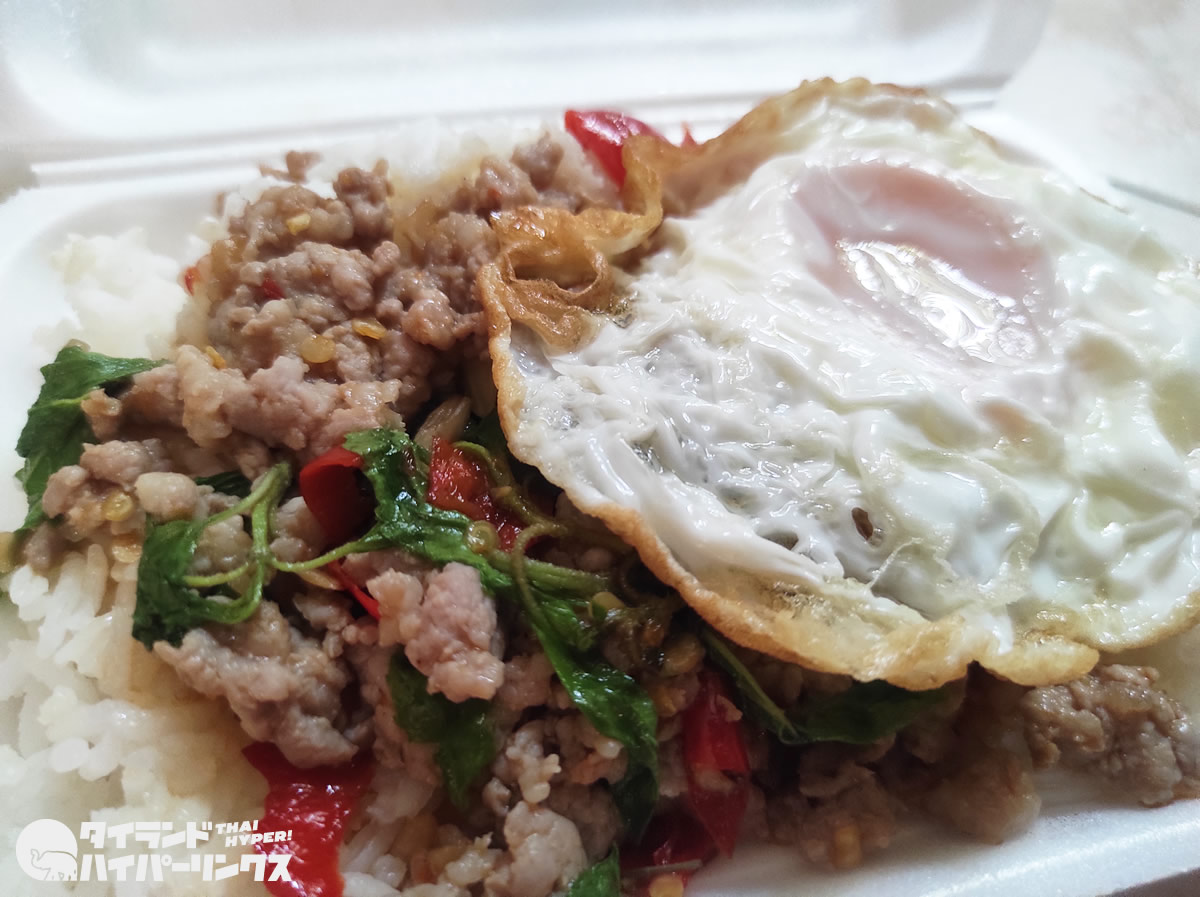 ガパオライスは目玉焼きが付いて45バーツ。以前と変わらぬ美味しさで、オジちゃんとオバちゃんの新型コロナウイルスからの完全復活を確信したのでした。
