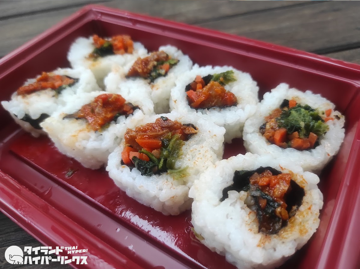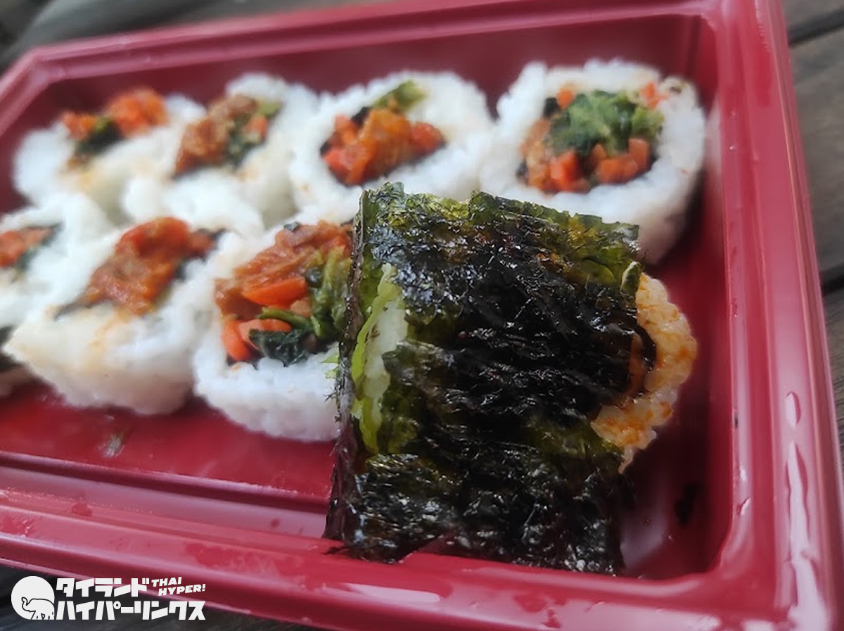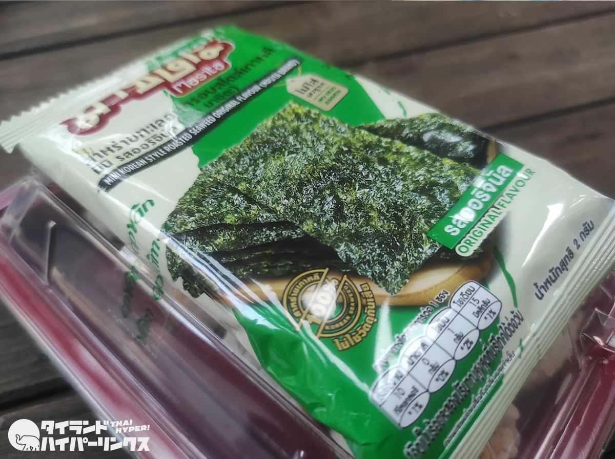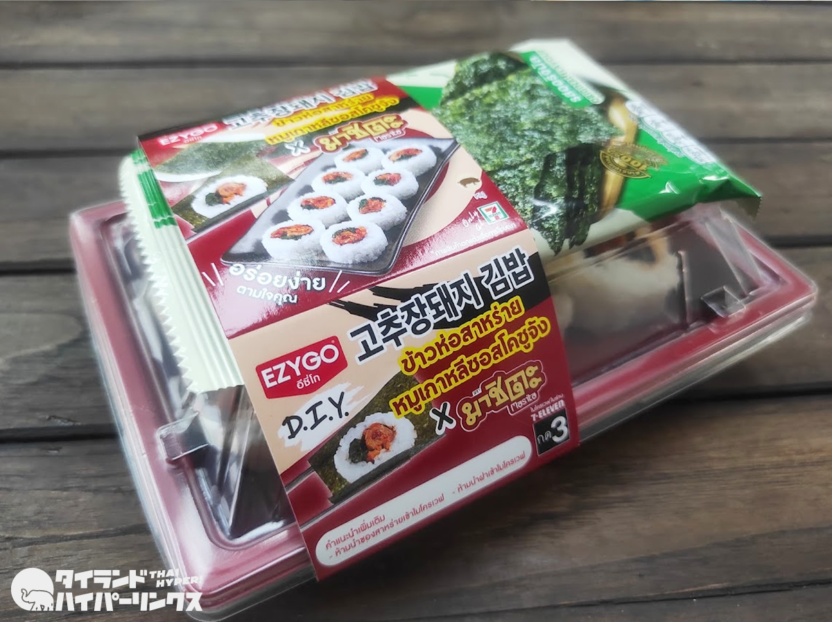 商品名は「ข้าวห่อสาหร่ายหมูเกาหลีซอสโคชูจัง ✕ มาชิตะ(カオホ-サライムーカオリーソースコチュジャン✕マーシタ)」。つまり「コチュジャン豚キムパプ」で、マーシタとは韓国のりスナックブランドのMasitaのこと。韓国のりは別付けで自分で巻くようになっているので、「DIY」と書かれているんですね。