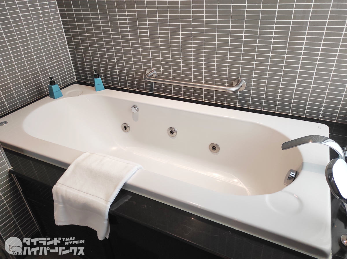 さらに奥にはバスタブが。ジャグジー付きのバスタブなので、せっかくならバスフォームを持参して、泡風呂を楽しみましょう!