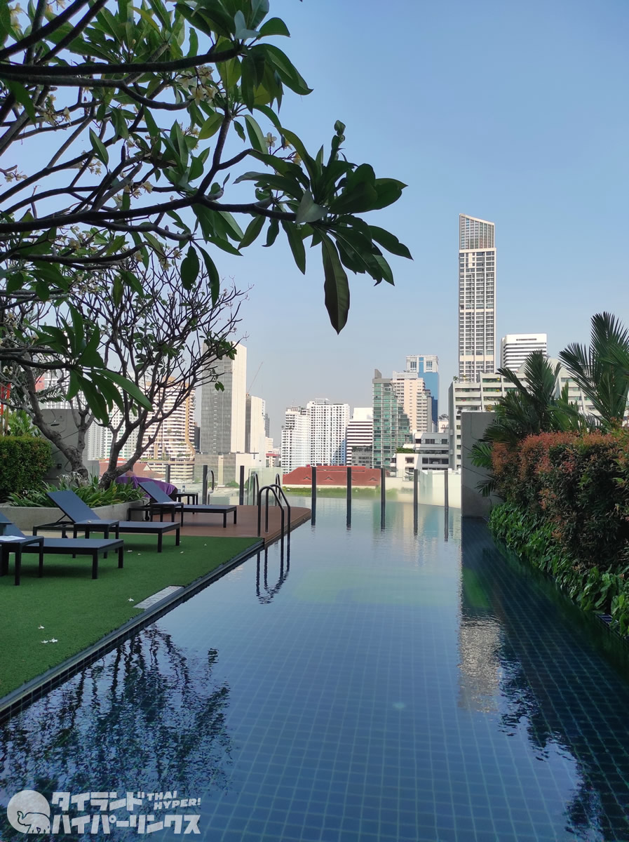 ホテル選びで拘りたいのがプールの良し悪しという人も多いのでは?「アロフト・バンコク」10階にあるプールは小さいながらも都会と自然に囲まれた空間といった風で、非常に快適。この時は青空の下、2組のカップルがチェアーで過ごしていました。
