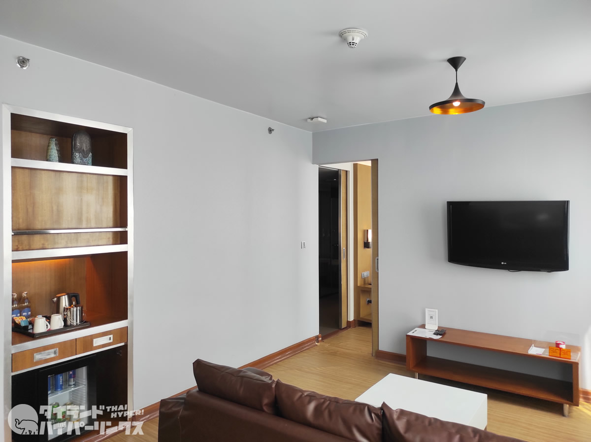 「スタイリッシュ・スイート」は広さ60平方メートルもあるため、家族で宿泊したとして十分な広さ。客室のドアを開けるとリビングルームが広がり、テーブルにチェア、大型テレビにソファー、そしてミニバーが設置されています。テレビは日本のチャンネルも2つ視聴することができました。