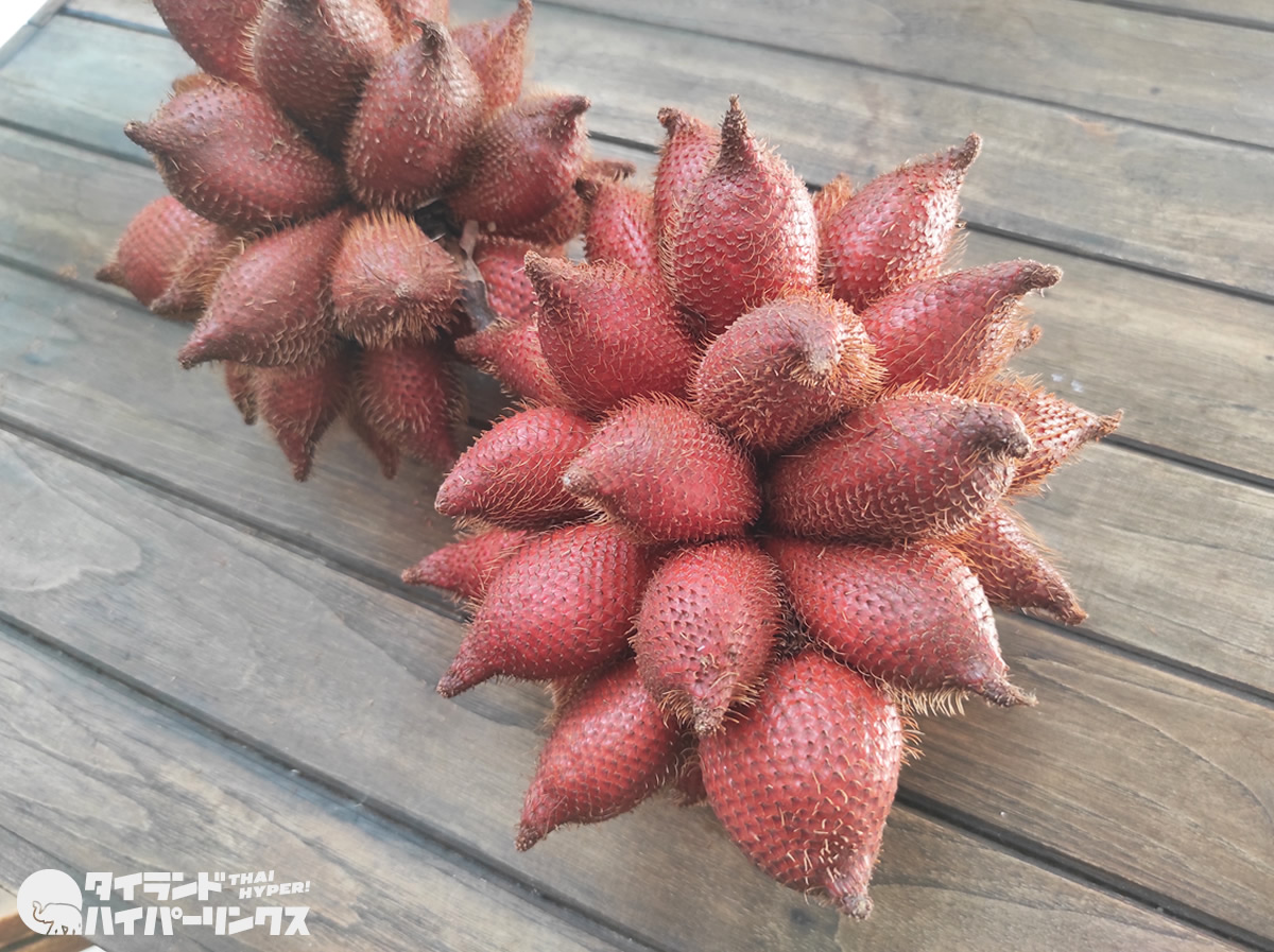 サラクの実は赤く、ラグビーボールのような形をしており、硬い皮全体に棘が生え、それが房になっています。