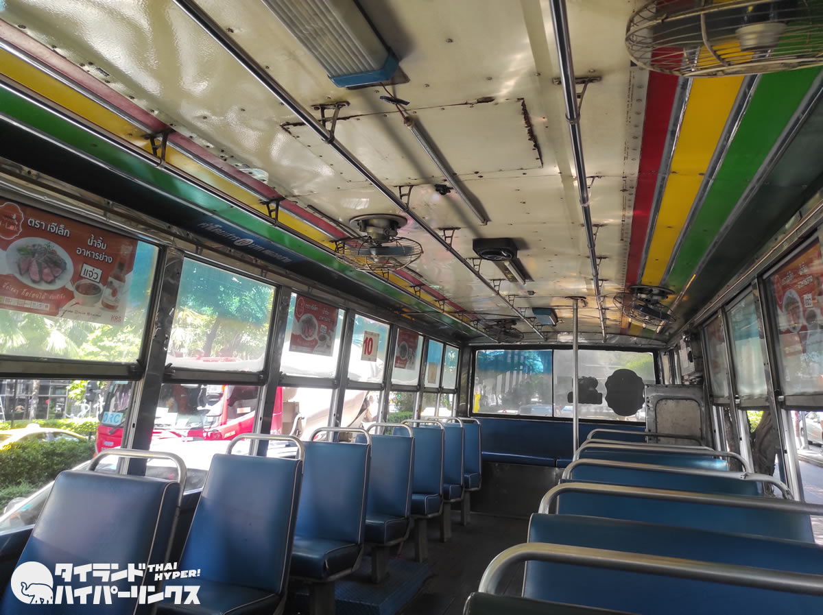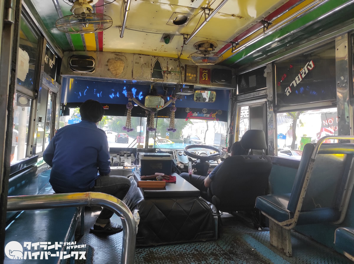 乗車して着席。集金係に10バーツを支払い、目的地へ。 運良く(?)この時は誰も客が乗っておらず、短時間ですが貸し切りでした。しかしノーエアコンバスは昔から変わらず、味わいがあります。