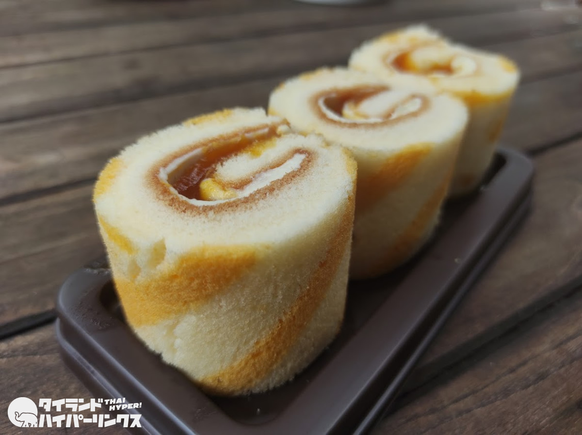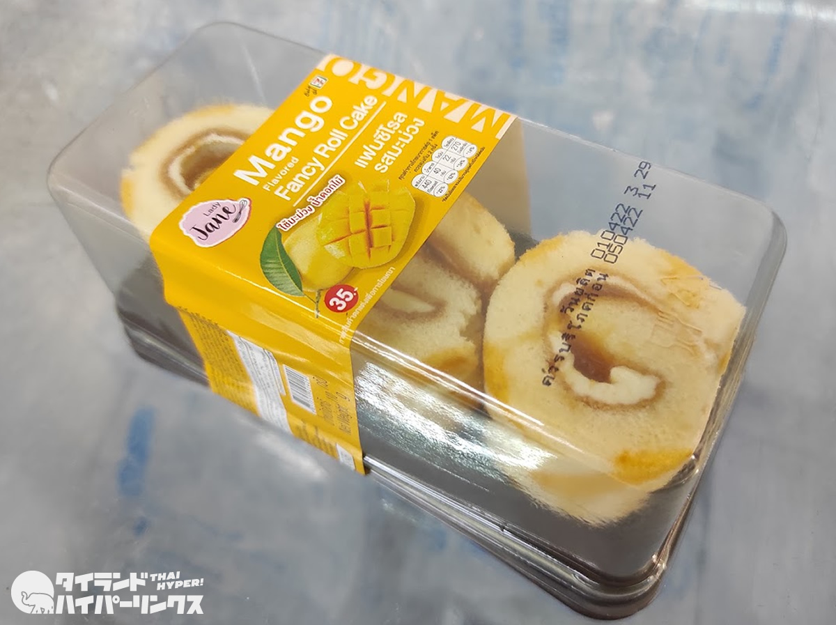 セブンイレブンのパンコーナーで見つけたのがマンゴーのロールケーキです。「Mango Flaverd」なので単にマンゴー風味ということでしょうか?タイ語では「ใช้มะม่วง น้ำดอกไม้」ナムドクマイ種のマンゴー使用と書かれています。成分が表示されたパッケージは捨ててしまったので、購入した型は各自ご確認ください。