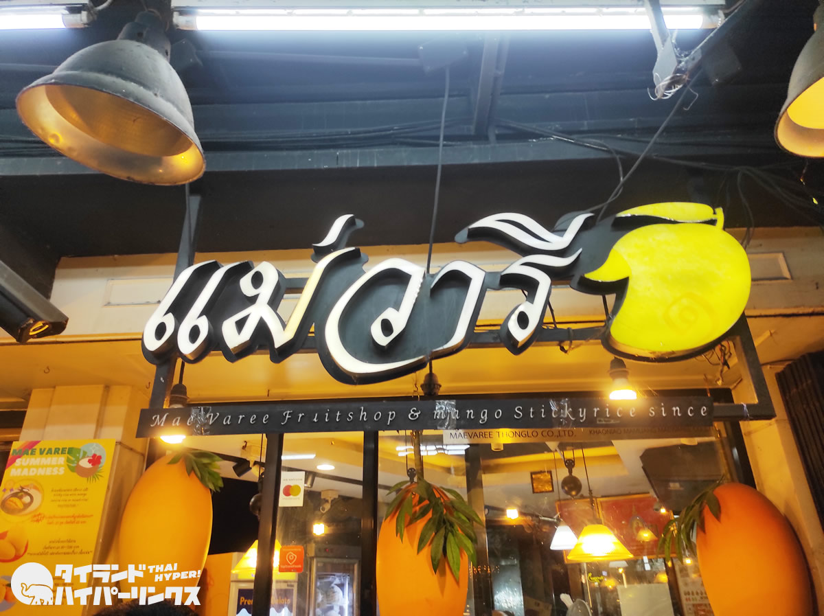 バンコク・BTSトンロー駅そばにあるカオニャオ・マムアン専門店「メーワリー(Mae Varee)」。大きなマンゴーのオブジェと、店頭に並んだ美しいマンゴーが目を引くお店です。