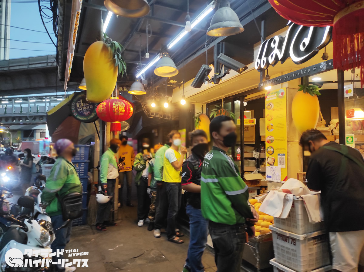 以前から外国人旅行者にも大人気の「メーワリー」ですが、今回の件で再び注目を集めているようで、先日に店の前を通ると、GtabやLINEMANといったデリバリーサービスのバイクドライバーの人たちの行列ができていました。