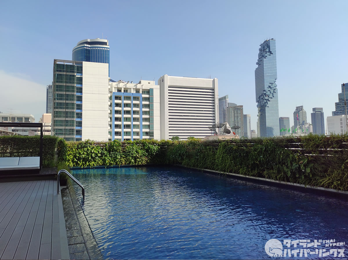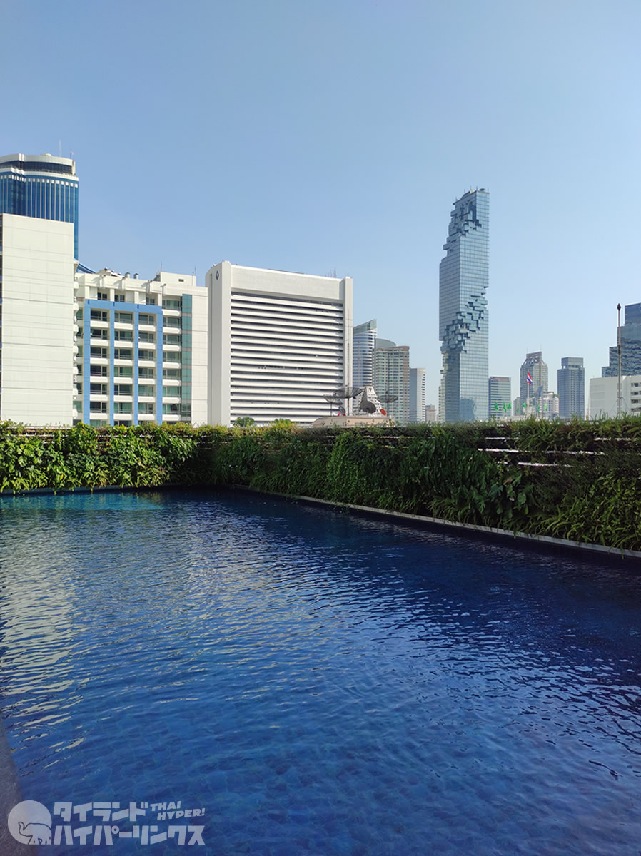 まずは6階にあるプール。この日は青空が広がるプール日和で、プールサイドでリラックスをしている人々もチラホラ。ちなみに、奥に見える崩れかけに見えるビルはマハナコンタワーです。