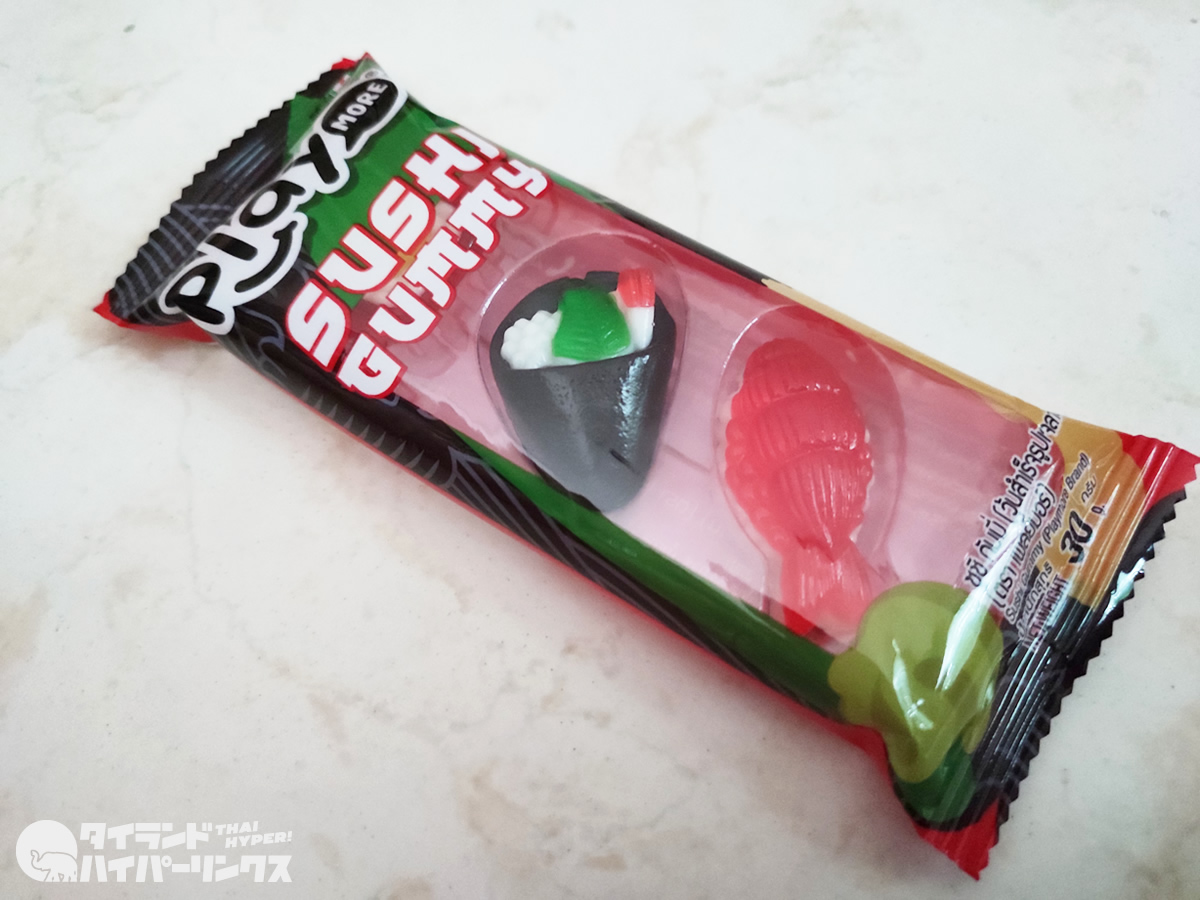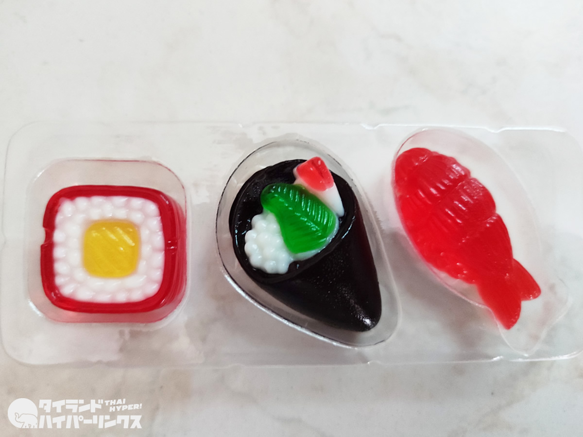 中身はこちらで、グミが3つ。色から見て、恐らくタイ人が大好きなサーモンの寿司をイメージしたものに違いありません。マグロっぽいですが、サーモンでしょう。