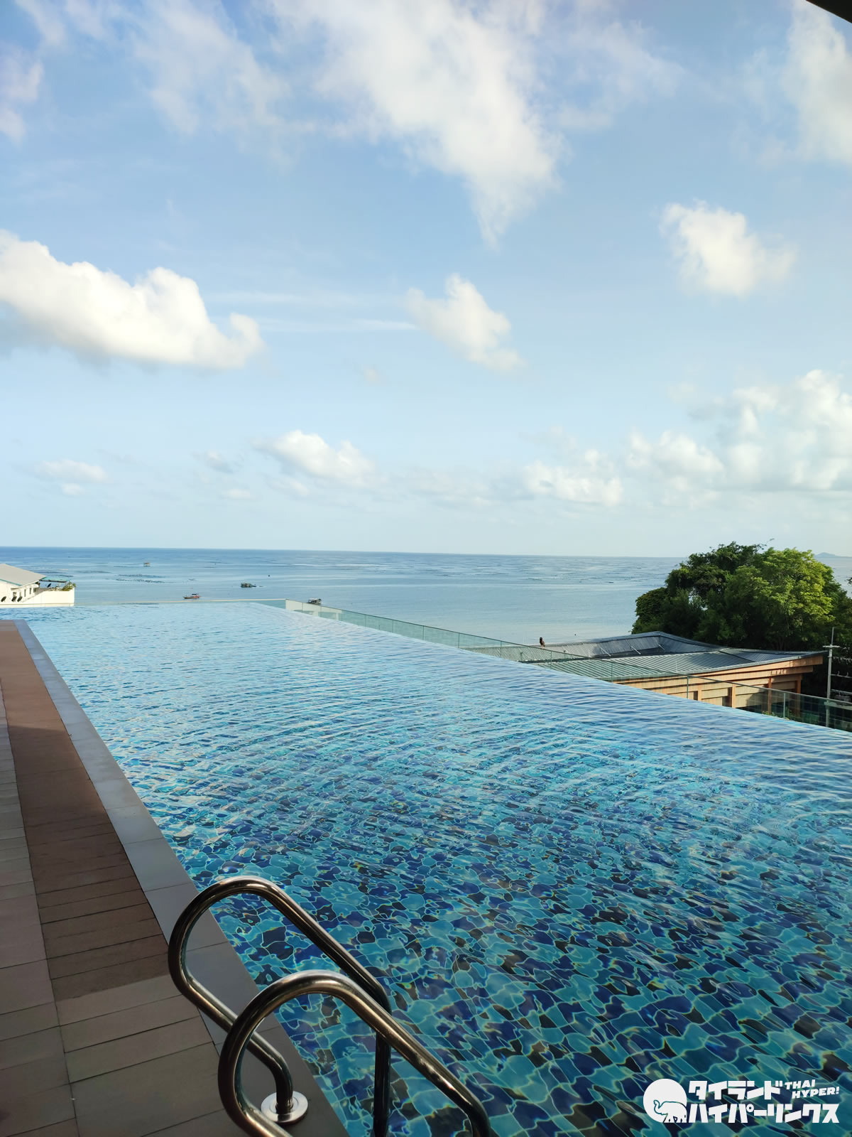 「Onsen」と同じ4階にあるスイミングプールは、なんと空や海とプールの水面がつながって見えるインフィニティープールです。