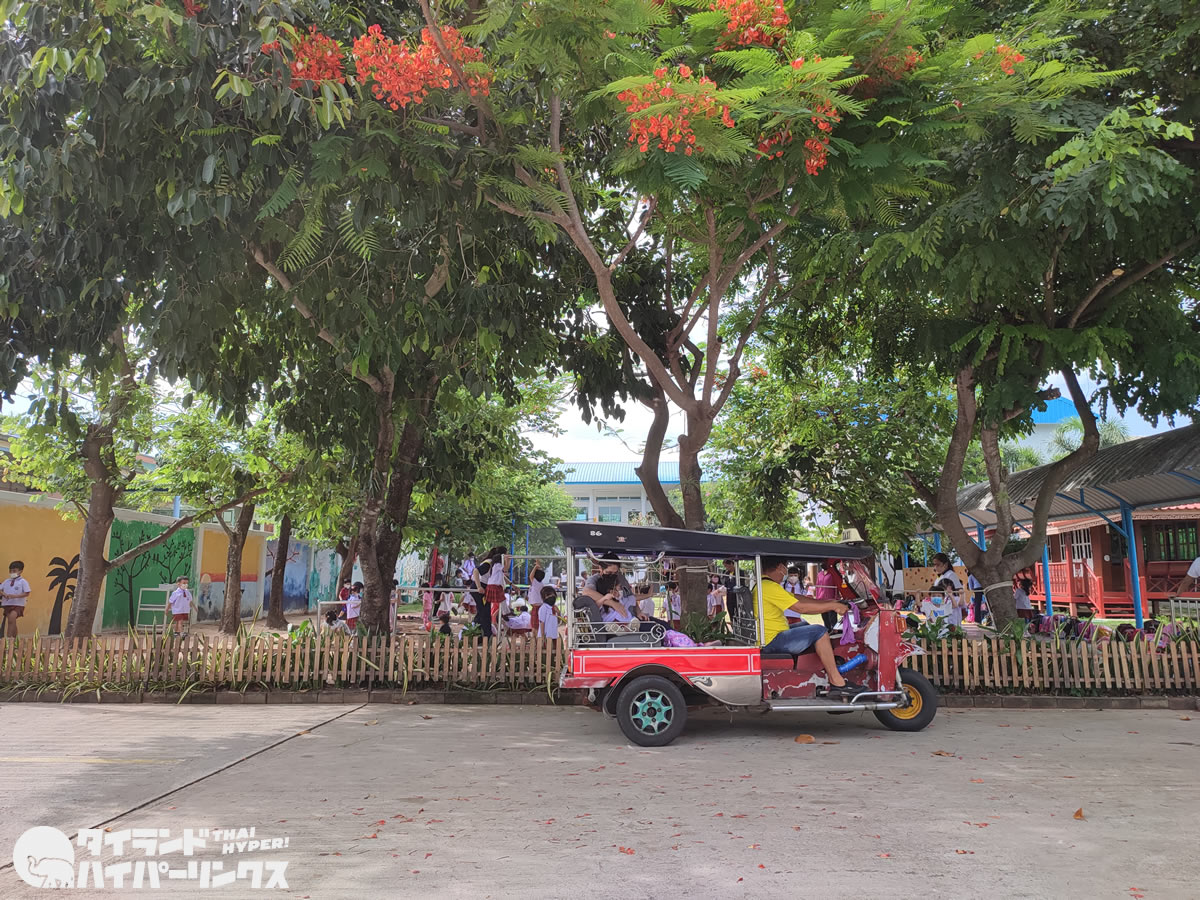 日本人に人気のある幼稚園。日本人のための「たんぽぽ幼稚園」です。ちょうどお迎えの時間で、正門の前にはバンが数台。