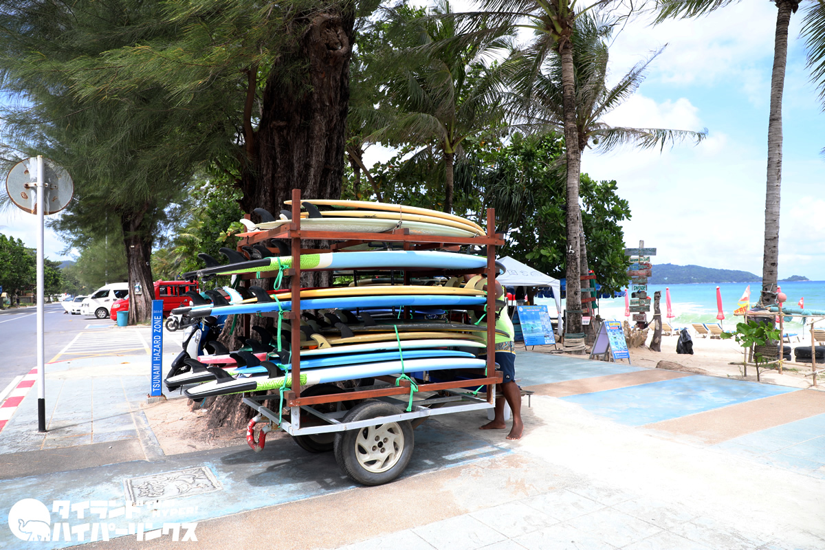 ボードを持ち運ぶのは大変ですが、パトンビーチではレンタルが可能。ボディボードが1時間200バーツ~、サーフボードが1時間300バーツ~なので、お手頃価格ですね。