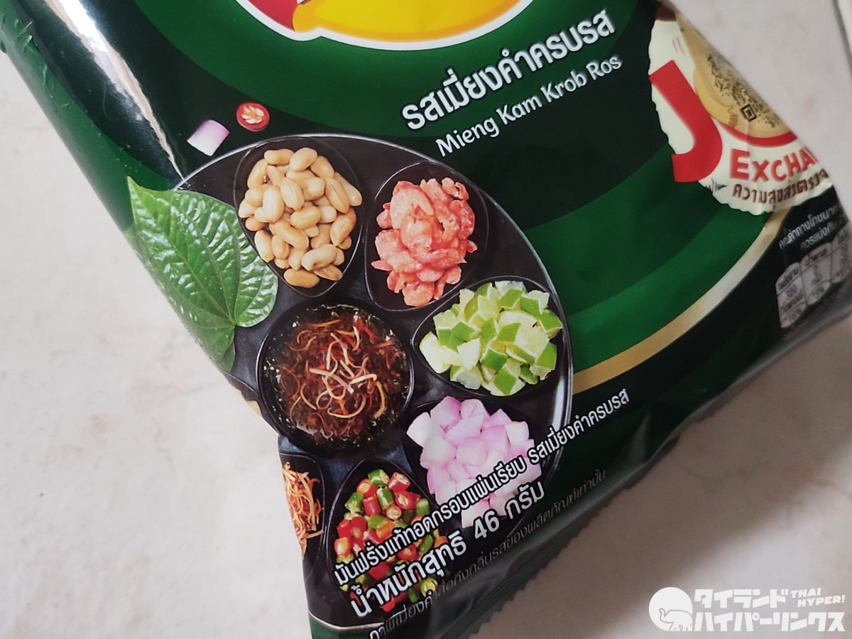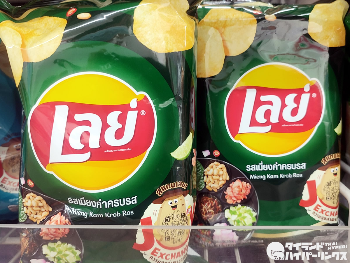 タイ最大手のポテトチップスブランドはレイズ(Lay’s)で間違いないでしょう。お店には沢山の種類のレイズのポテトチップスが並んでいますが、今回手を伸ばしたのが、タイ料理味のポテトチップス「ミヤンカム(เมี่ยงคำ)」味です。