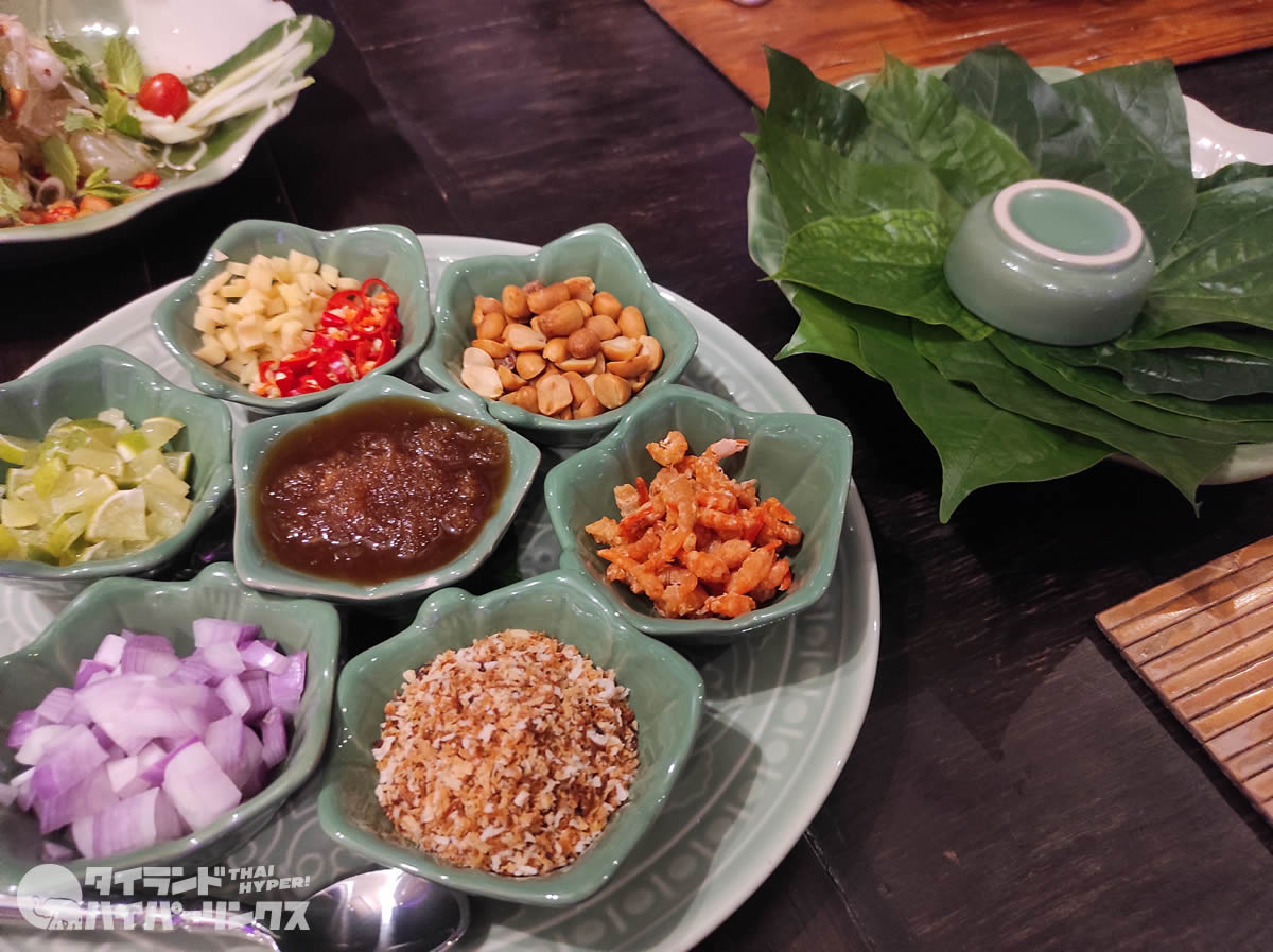 「ミヤンカム(เมี่ยงคำ)」とは、主にハイゴショウの葉に、干しエビ、マナオ(ライム)、エシャロット、唐辛子、ピーナッツなどを包んで食べる一口料理。見た目も可愛らしくお洒落で、タイを訪れたらぜひ試したい一品です。