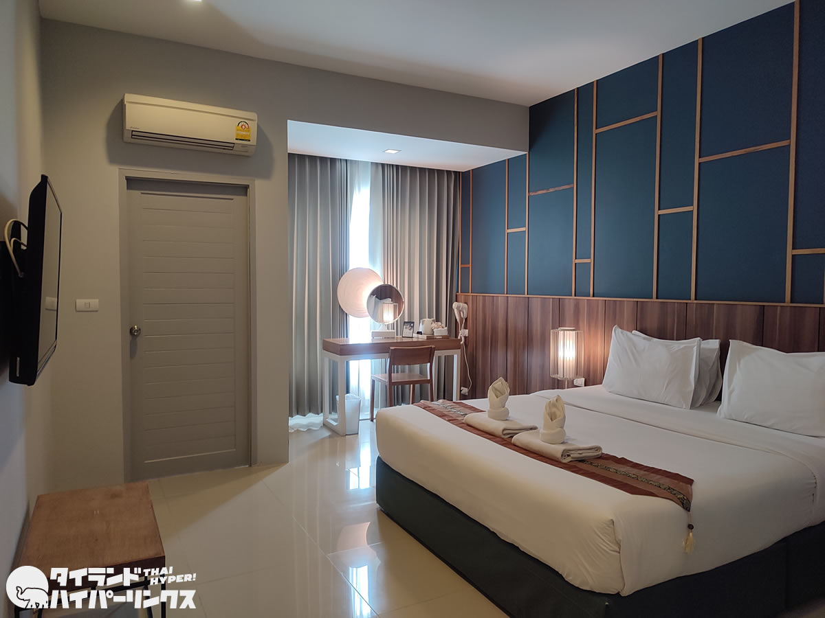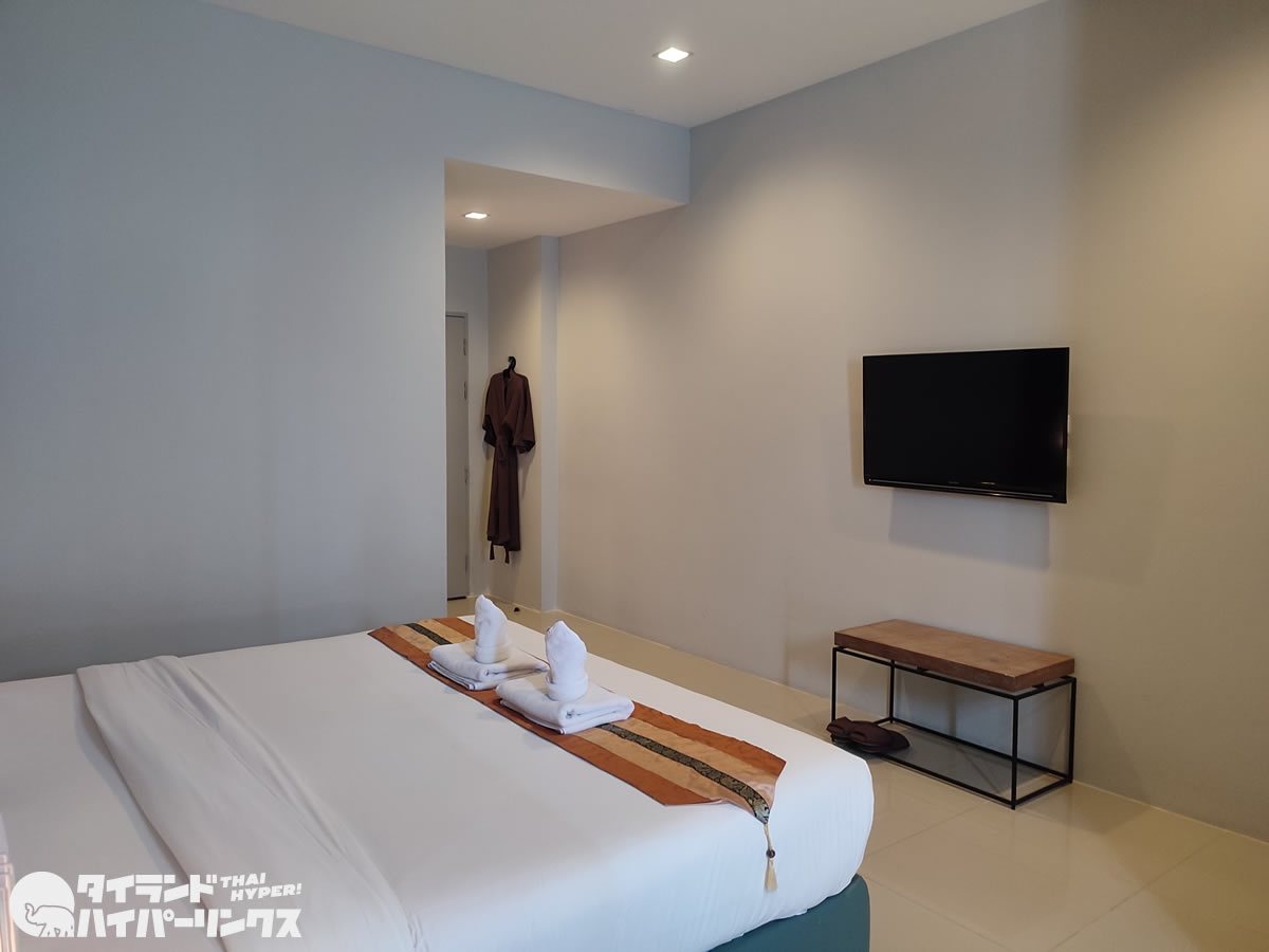 今回予約した客室は2階のダブルルーム。広々とした空間に、大きくて快適なベッド。大型テレビにデスク、冷蔵庫やドライヤーなどが揃っています。なお、クローゼット部分には扉がないですが、目立たない作りになっているので、部屋がゴチャゴチャした印象にはなりませんでした。