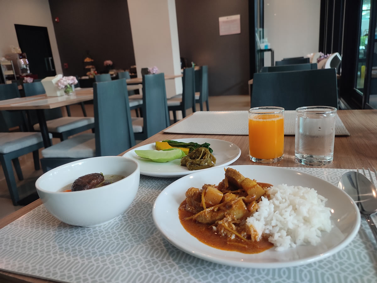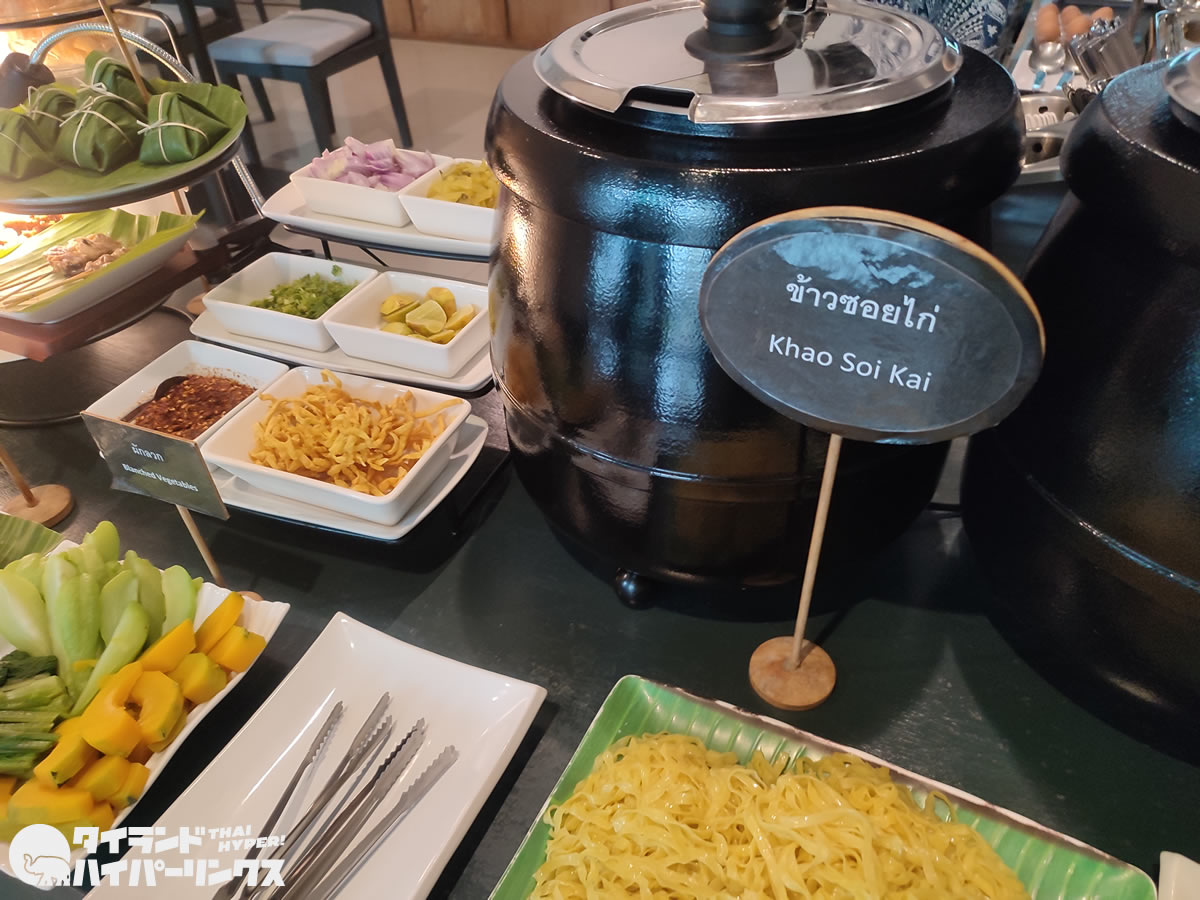 嬉しいことに「ハグ ニマン ホテル」の朝食ビュッフェのラインナップには北タイ料理が並びます。この日は、北タイのカレー麺「カオソーイ(ข้าวซอย)」と北タイカレー「ゲーンハンレー(แกงฮังเล)」があり、欲張って両方ともいただいてしまいました。