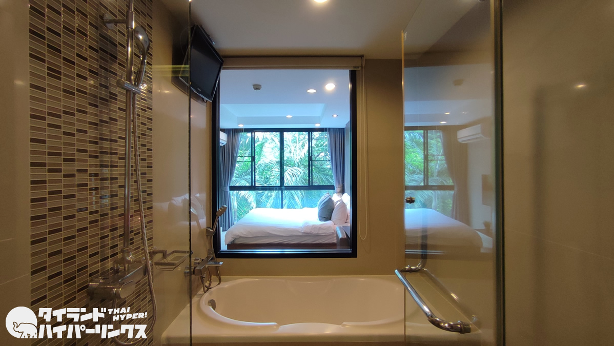 バスルームからの眺めも、ベッドルーム越しの窓の外に緑が見えて気持ちいいですね。バスタブの上には、オーナーこだわりのテレビです。