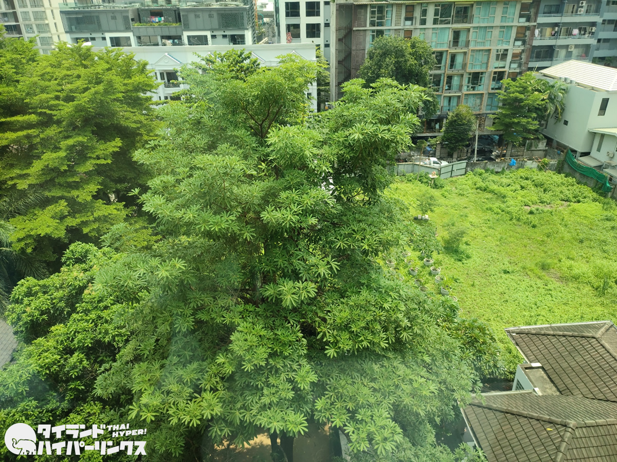 先日宿泊した「アッパースイーツ スクンビット25」がスクンビット通りに近くて部屋によっては窓からBTSスカイトレインが見られるのに対し、今回宿泊した「アッパースイーツ スクンビット23」はソイ(小道)の奥まった住宅街のような場所にあるので静かです。しかも近くの豪邸の豊かな緑が部屋から目に入ってくるので、ちょっとしたリゾート気分(笑)。