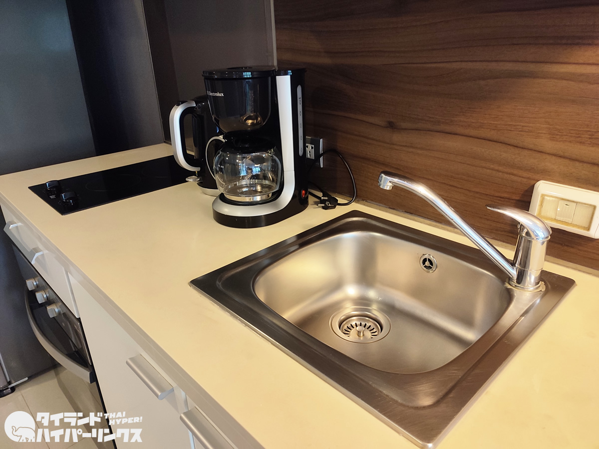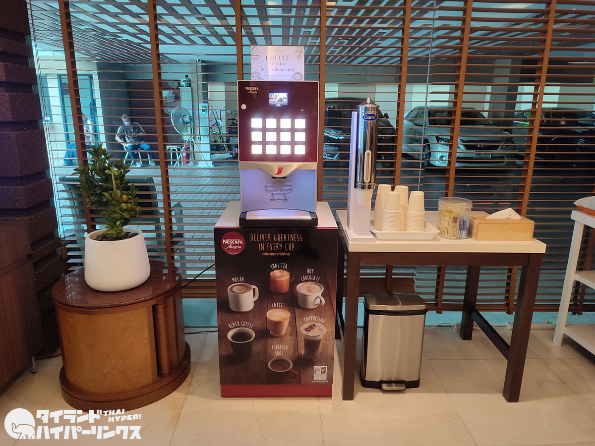 「アッパースイーツ スクンビット23」のロビーには「スクンビット23」と同様に、住民のためのコーヒー・紅茶サーバーがありました。タイ紅茶でもアメリカンでも飲み放題です。