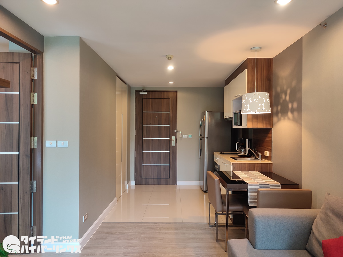 リビングからキッチンと入り口ドアの方を見ると、こんな感じ。この部屋はワンベッドルームで、リビングとダイニングキッチンの部屋と寝室、そしてバスルームに分かれています。中にはベッドルームが2つの部屋もあるので、家族でも暮らせますね。