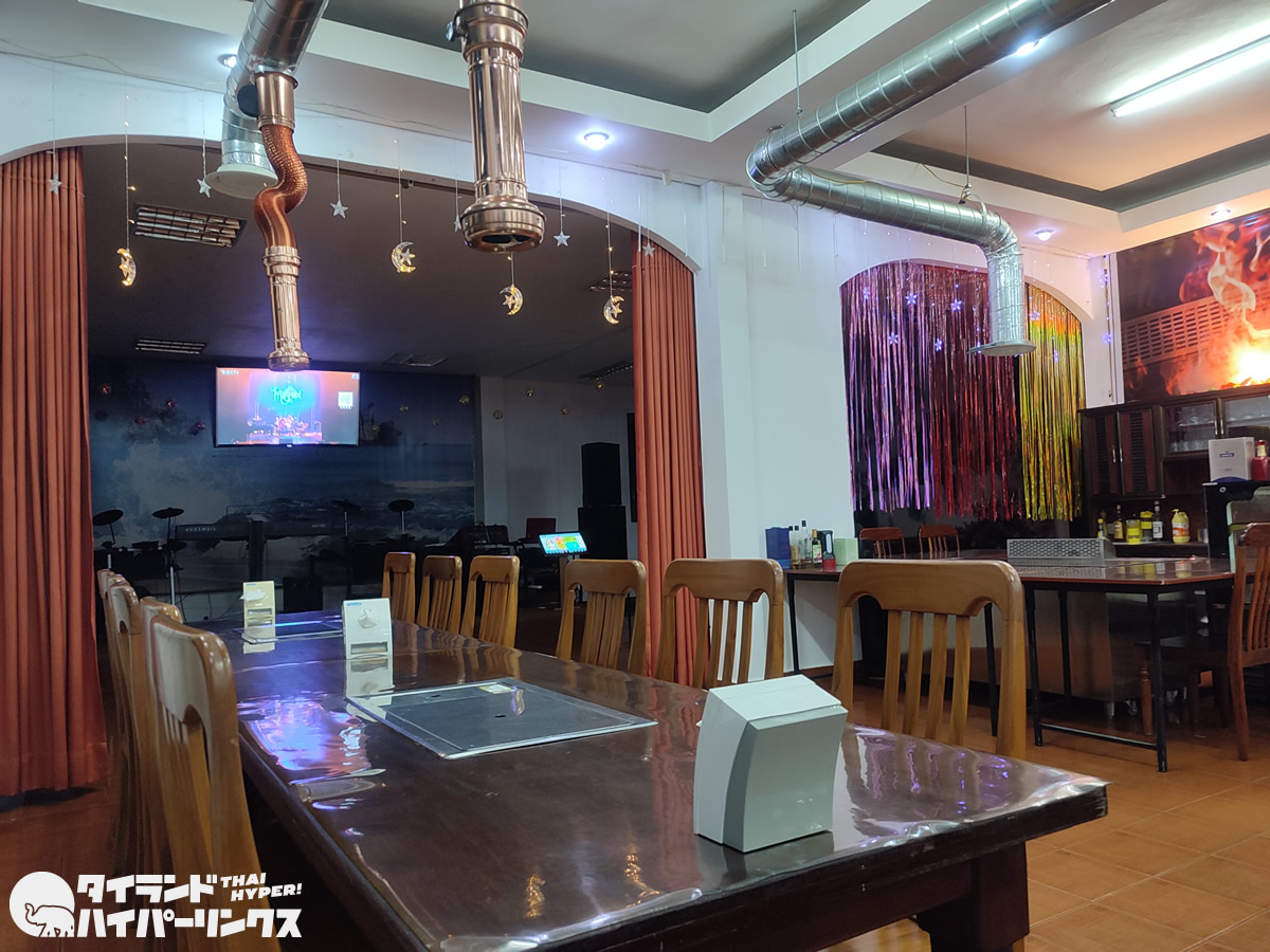 店には2階席もあり、1階奥の大きなモニターがある場所はショーのエリアでしょうか。しかし店員さんによると、残念ながら今は北朝鮮人女性によるショーは行なっていないのだと言います。(「今の時間はショーがない」と意味の可能性もあります。)