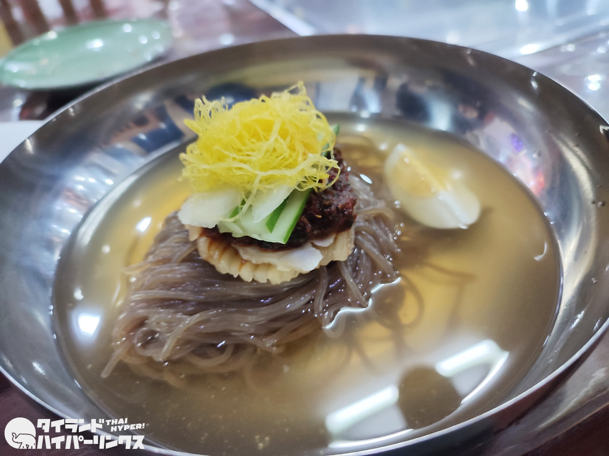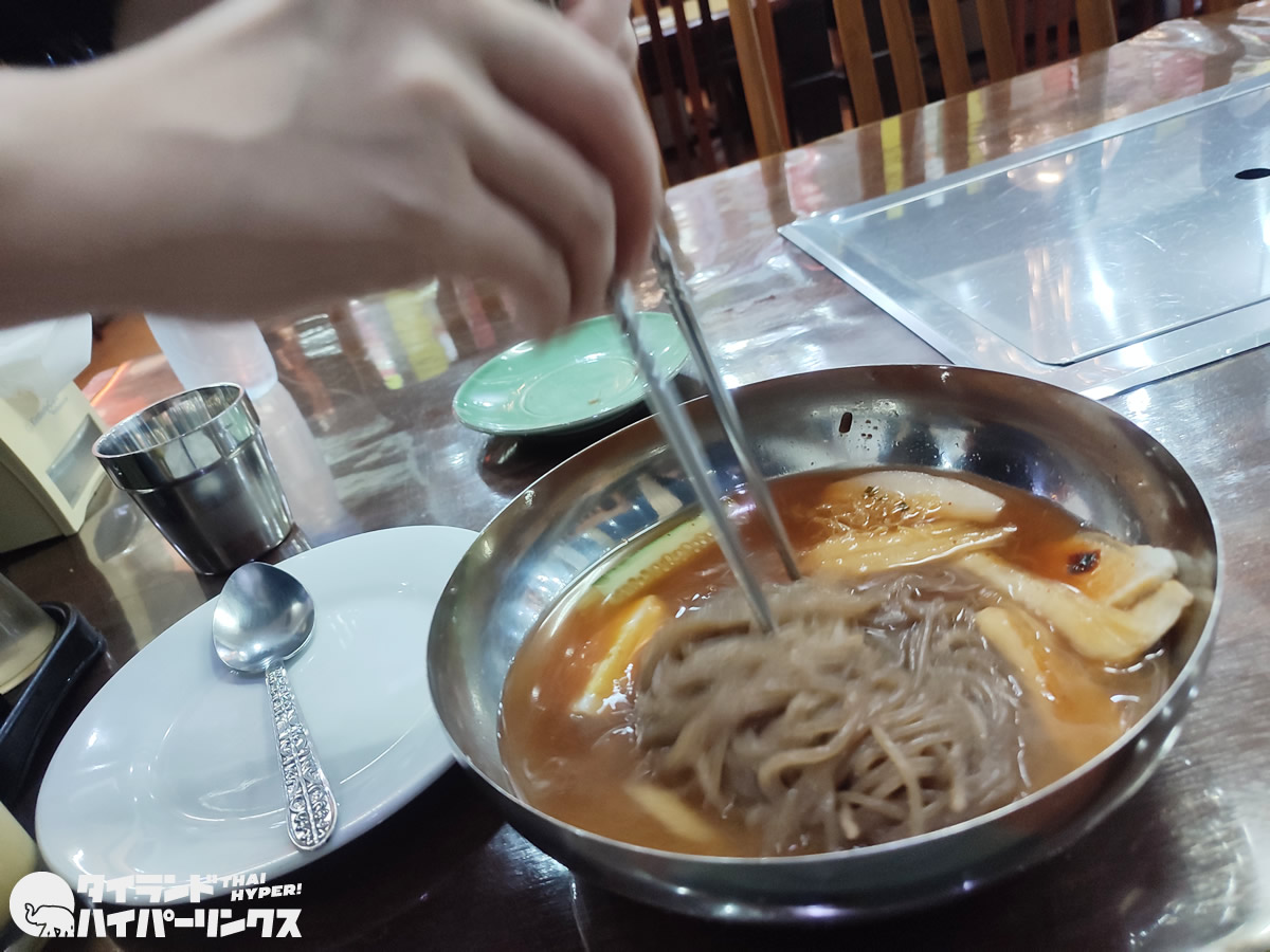 運ばれてきた冷麺は、北朝鮮人女性スタッフがカラシやお酢を入れて味を調整してくれます。ハサミで麺をチョキチョキというのはありません。