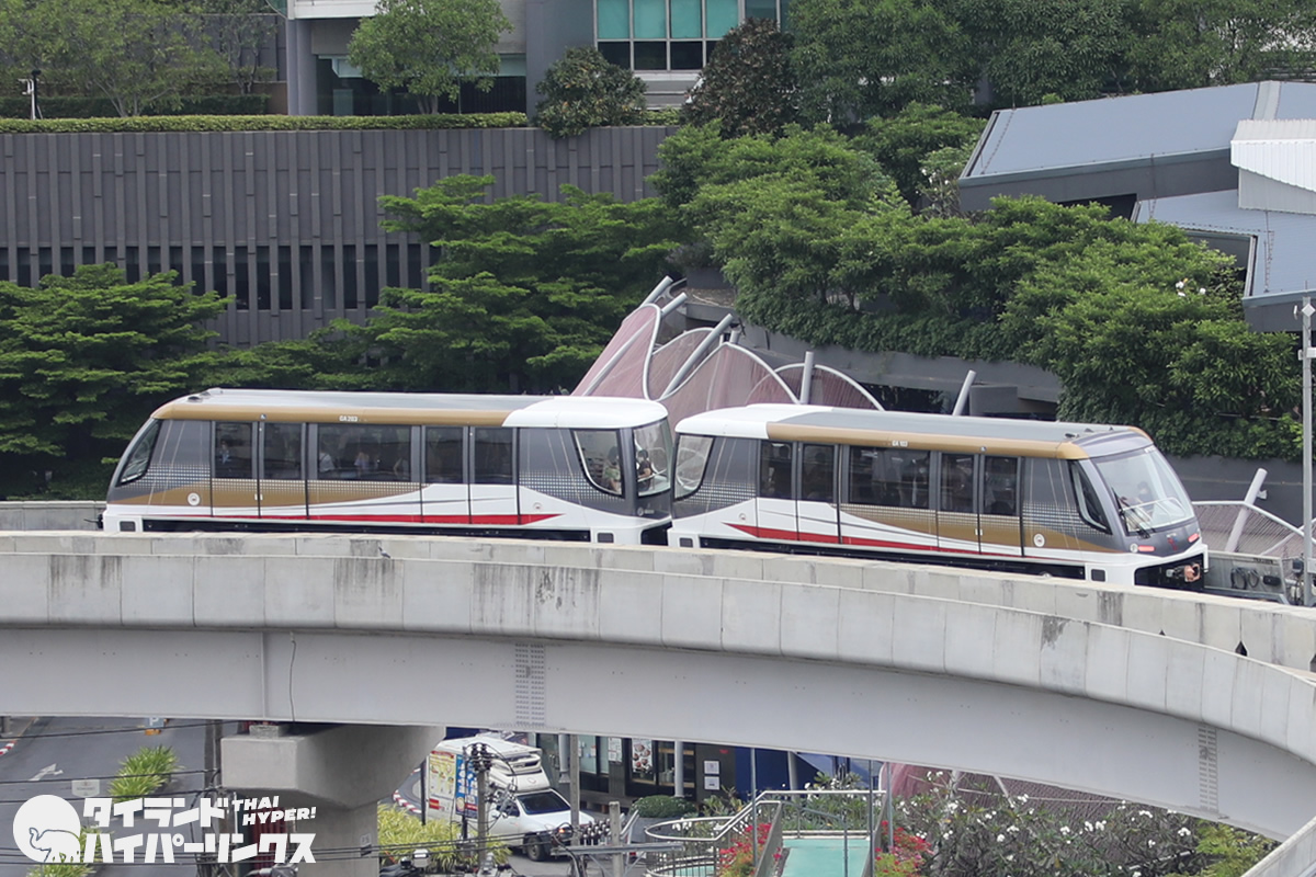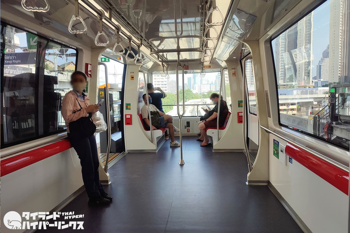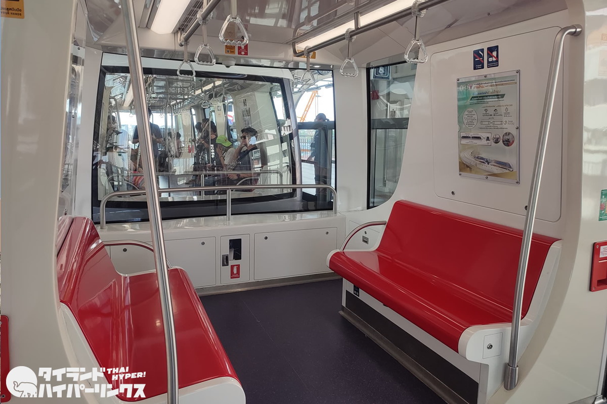 開業してまだ2年。パンデミックで利用者が少なかったこともあるのでしょうが、車内はピカピカ。なにより嬉しいのが、景色が良いこと。BTSの車両の場合は窓まで広告のラッピングがしてあって外がよく見えないのですが、ゴールドラインには広告ラッピングがないので、外がとても良く見えます。