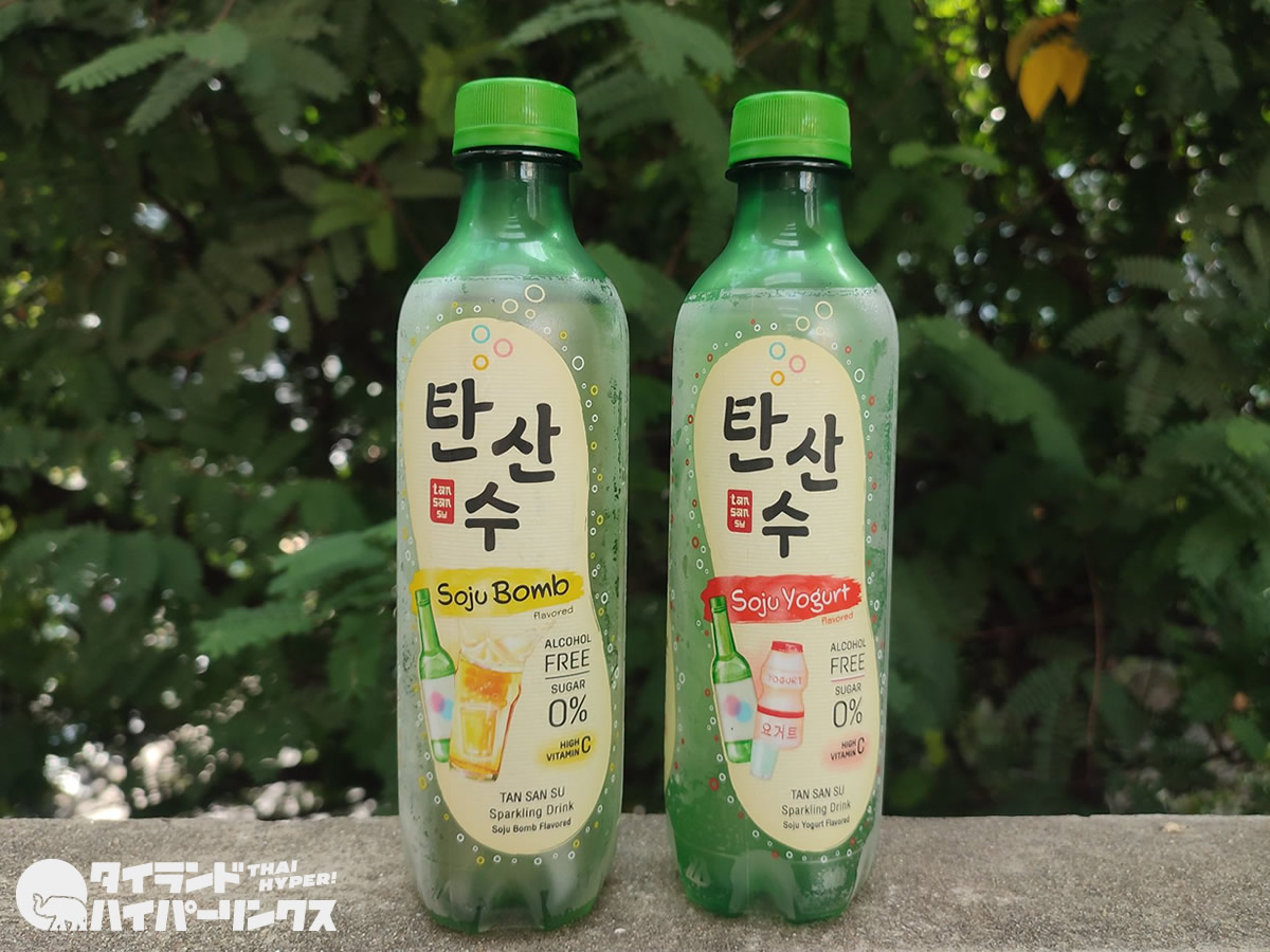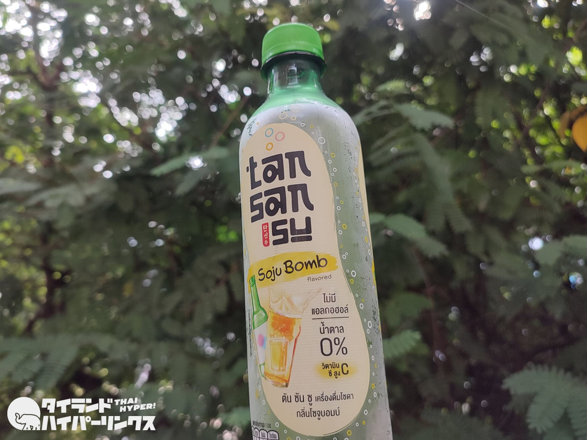 コンビニの冷蔵棚で、ハングル文字の入ったドリンクを発見。アルファベットではSojuと書いてあり、つまり焼酎のことですね。ノンアルコールの焼酎風味ドリンク「Tansansu」は、「Soju Bomb」と「Soju Yogurt」があり、1本20バーツです。