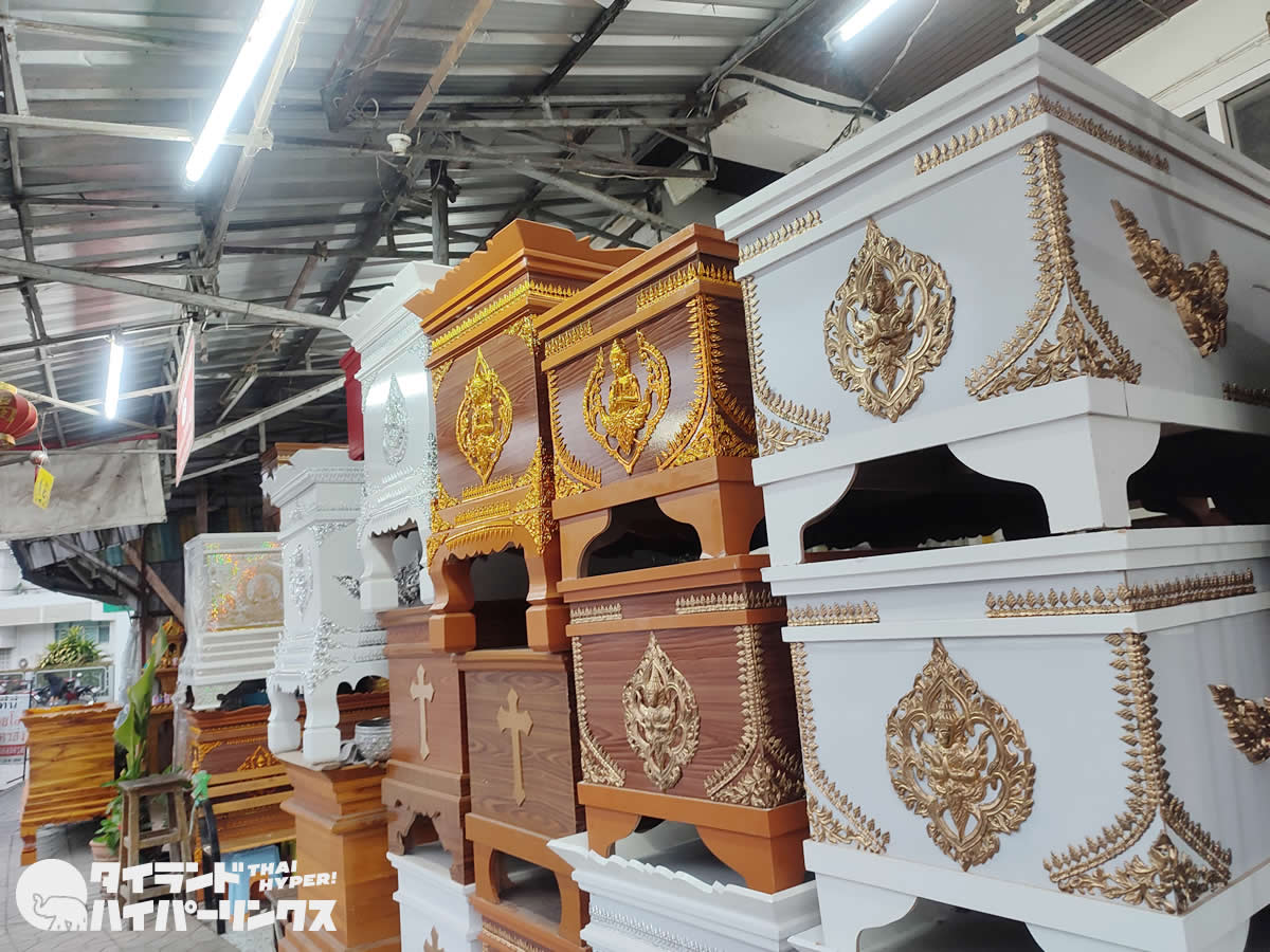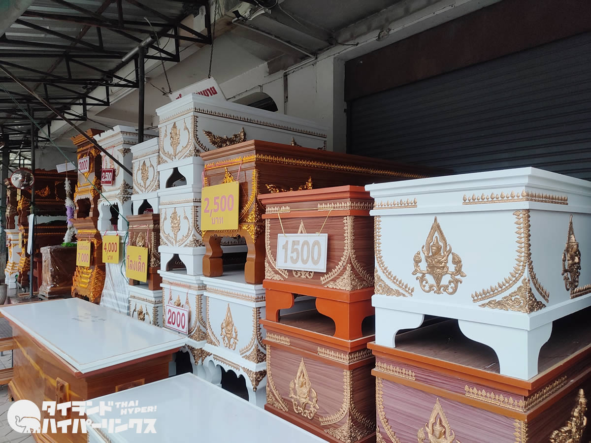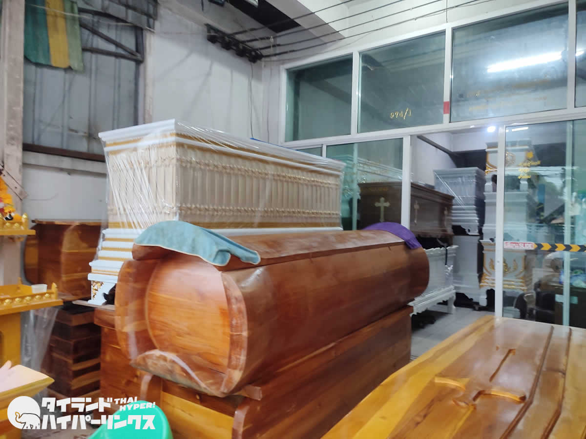 何十個もの棺桶を見るのはこれがはじめて。値札がついているものでは、1500バーツ(約6000円)から7000バーツ(約2万8000円)まで揃っており、予算や好みに合わせてデザインが選べるようです。また、十字架のついた、キリスト教徒用も並んでいます。