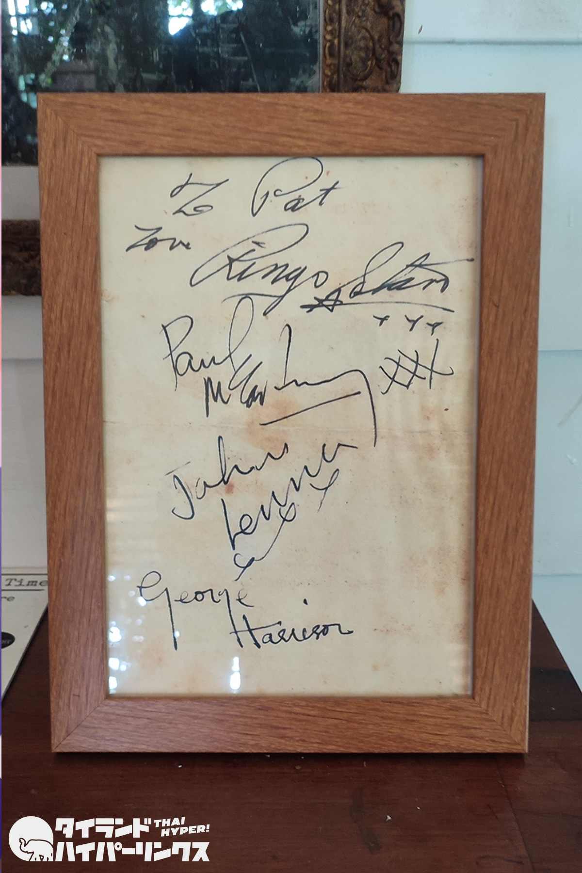 パッと見たときは「古いサインがあるな~」と思っただけでしたが、よく見てみると上からリンゴ・スター、ポール・マッカートニー、ジョン・レノン、ジョージ・ハリスンと書いてあることに気づきました。ビートルズのサインなんですね。本物なのかは不明ですが、本物であれば日本円にして120万円は超えるようです。(出典 開運 なんでも鑑定団)