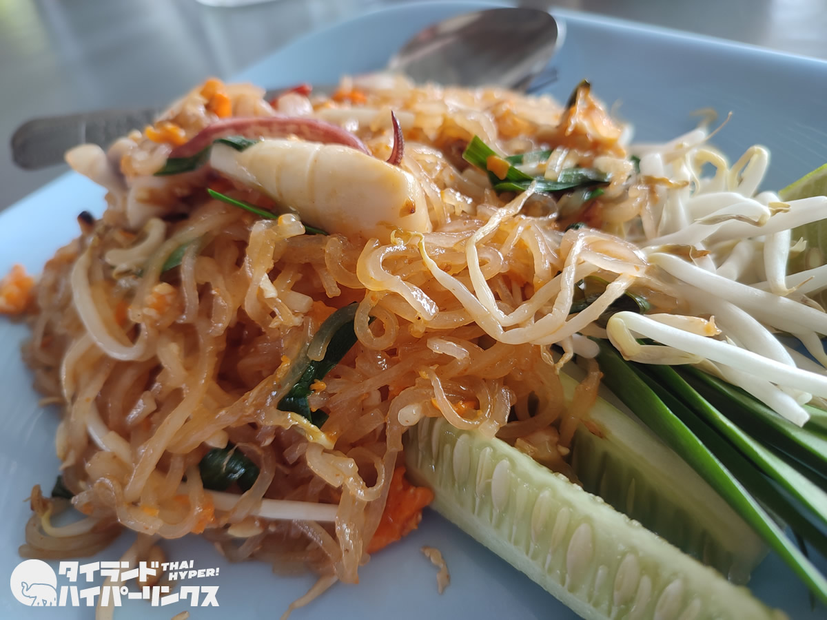 甘めに味付けされて辛くないパッタイは、日本人の口にも合う人気のメニュー。ラヨーン県は海があるだけに、エビやイカも新鮮で美味しいですね!