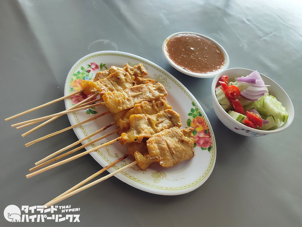なお、一緒にオーダーしたのは「サテ(สะเต๊ะ)」という肉の串焼き。タイやマレーシアやインドネシアやフィリピンなど東南アジアに広がる料理で、ピーナッツソースなどでいただきます。付け合せのキュウリの酢漬が食欲を増進させますね。