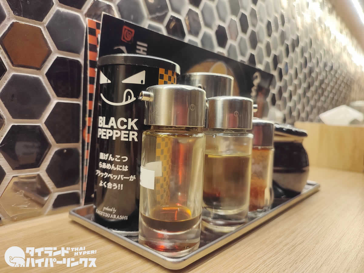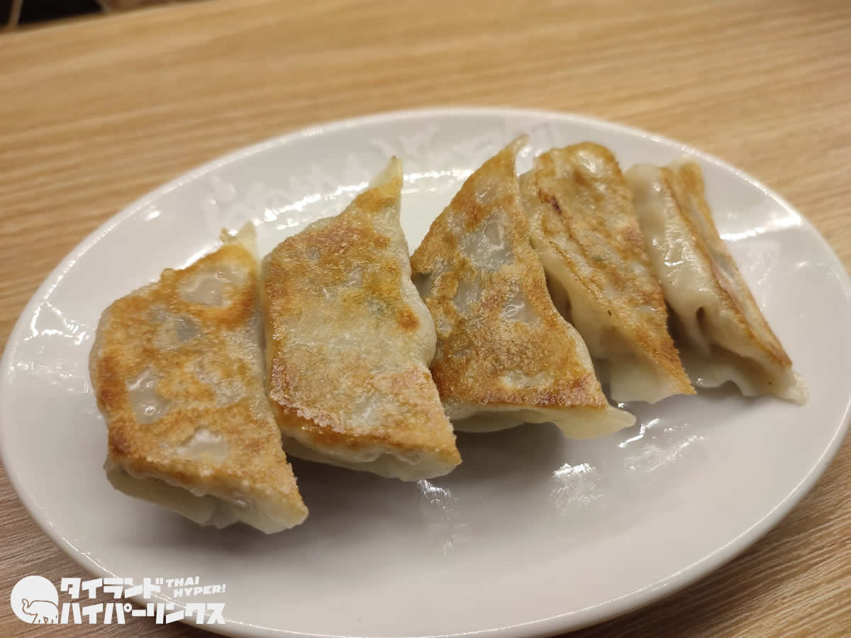 「そろそろ入れますよ」という時になって店員さんがオーダーを取りに来たので、人気ナンバーワンだという「嵐げんこつらあめん」のRサイズをオーダー。なおSサイズ<90グラム>で145バーツ(約560円)、Rサイズ<130グラム>で185バーツ(約715円)でした。さらに「餃子」は69バーツ(約270円)。「冷たい緑茶」はグラス1杯で35バーツ(約135円)。ちなみにすべて、税込み価格です。