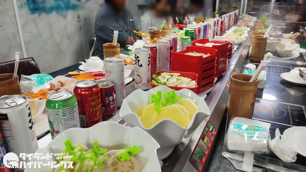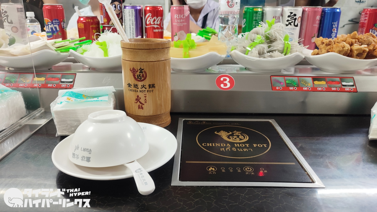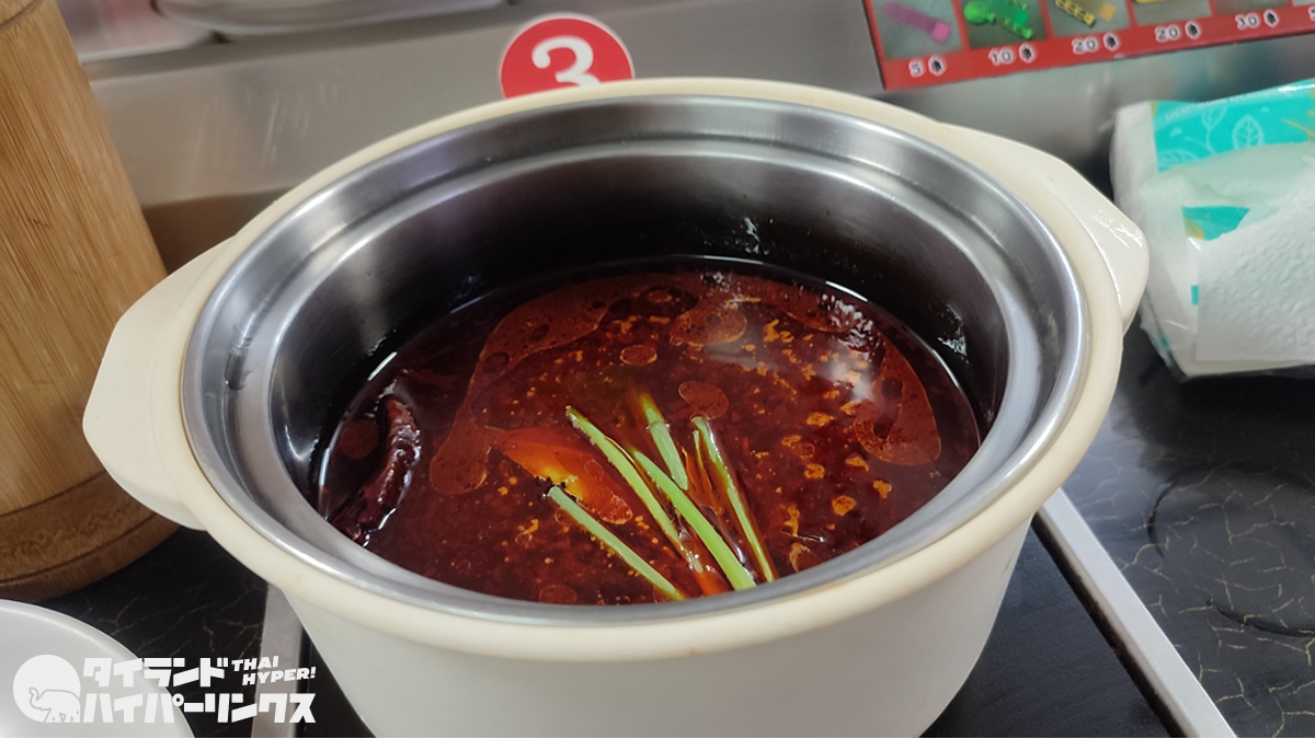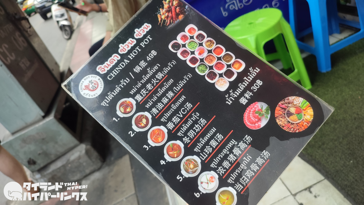なお「CHINDA HOTPOT」の価格は、鍋のスープ代が49バーツ、タレ(ナムチム)代が30バーツで、あとは食べた分だけ支払うシステムです。スープには麻辣スープといった辛いものから、きのこスープやチキンスープなど辛くないものまでお好みで選ぶことができます。鍋は一人用なので、友人らと一緒でも、好きなスープを選べるのが嬉しいですね。