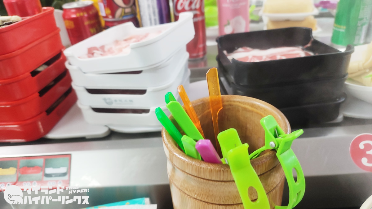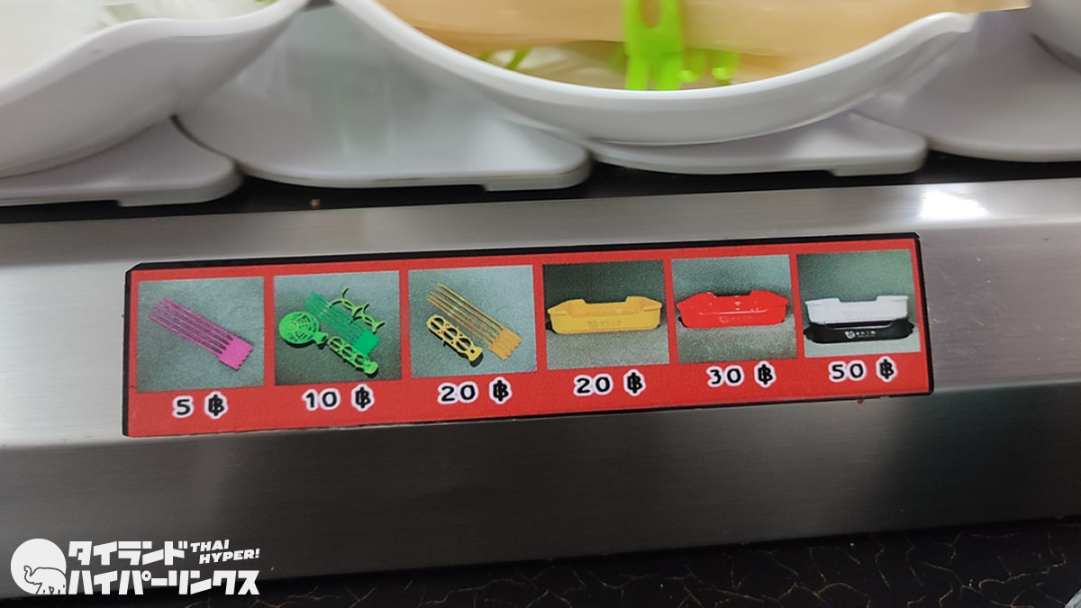 回転寿司のように流れてくる具材は、串やクリップ、皿の色ごとに料金が分かれていて、一番安いのは5バーツからで、高くても50バーツ。