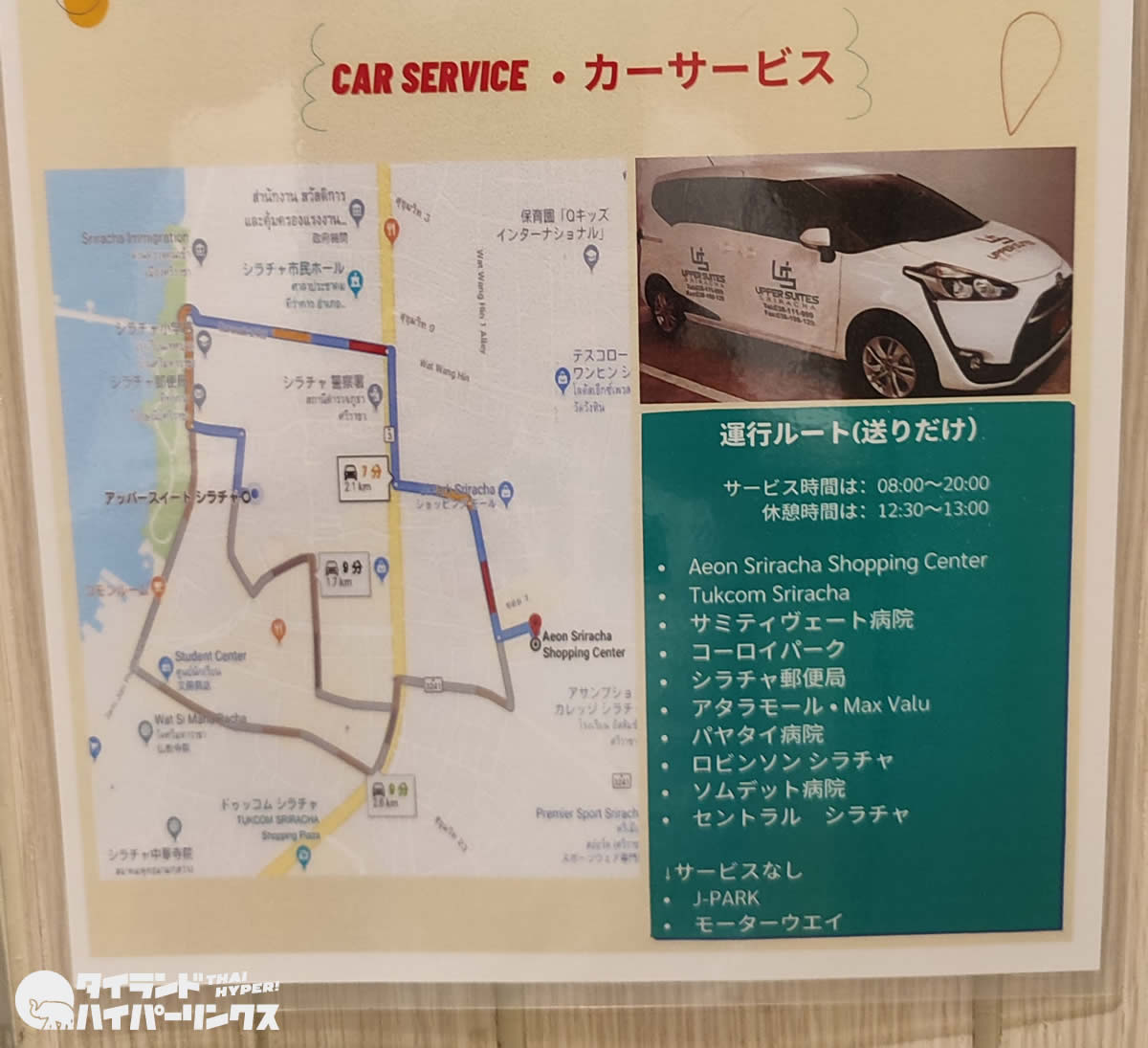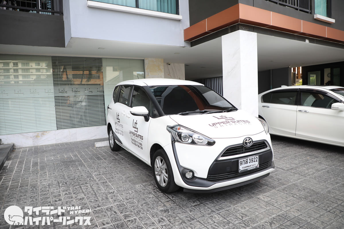 日本人居住率100%、スタッフ日本語対応の「アッパースイーツ・シラチャ」は、多くの日本人向けのレストランなどの店舗が集まる中心エリアまで徒歩圏内という立地の良さが特徴のサービスアパートメント。ちょっと離れた場所へ行くにも、送迎サービスがあるのが嬉しいのです。(送るのみでお迎えはありません)